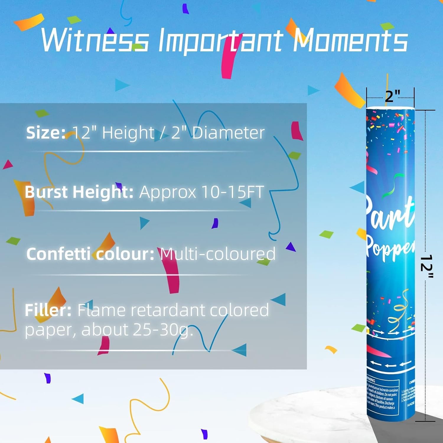 • CONFETTI CANNON 12 PACK - High quality party poppers confetti shooters,The length of the confetti cannon is 12 inches,adequate confetti content,biodegradable multicolor confetti are sprayed in the air and pushing the party atmosphere to a climax,with confetti spraying out,we cheered and were immersed in happiness
