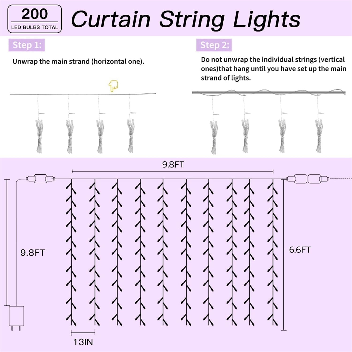 • 9.8FT x 6.6FT Coverage with 200 Brilliant LEDs - Soagrc 9.8FT x 6.6FT curtain features 200 warm white LEDs for a soft, ambient glow. Hang them over your bedframe, behind sheer curtains, or across a large window to create dreamy lighting. Includes a 9.8FT extension cord for easy positioning even in hard to reach outlets