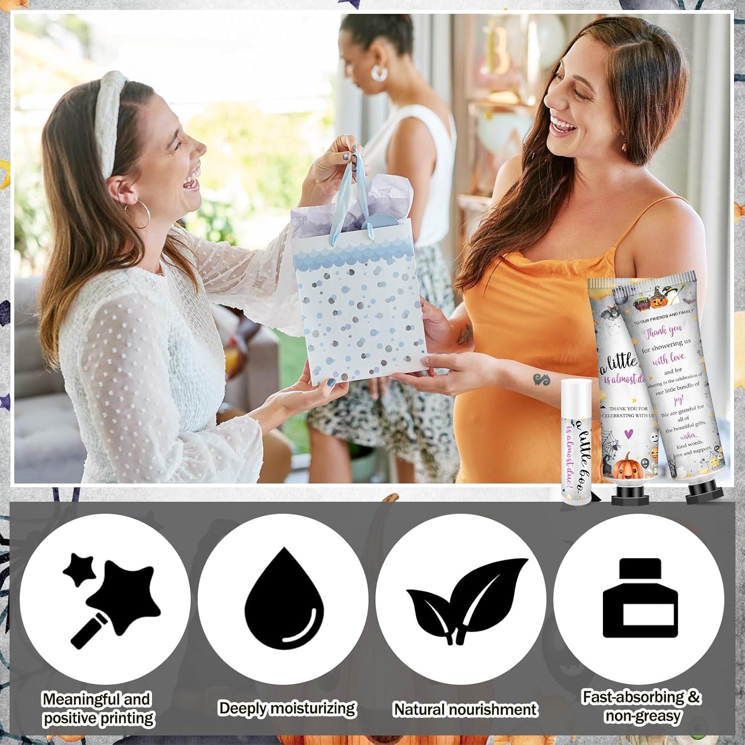 • Exquisite Little Boo Themed Design: ghosts and spider webs patterns and the warm and thankful words like [a little boo is almost due], enhance the gift giving atmosphere; This ensemble of hand lotion and lip balm lifts up the charm quotient of any event whilst bringing a sense of unexpected joy