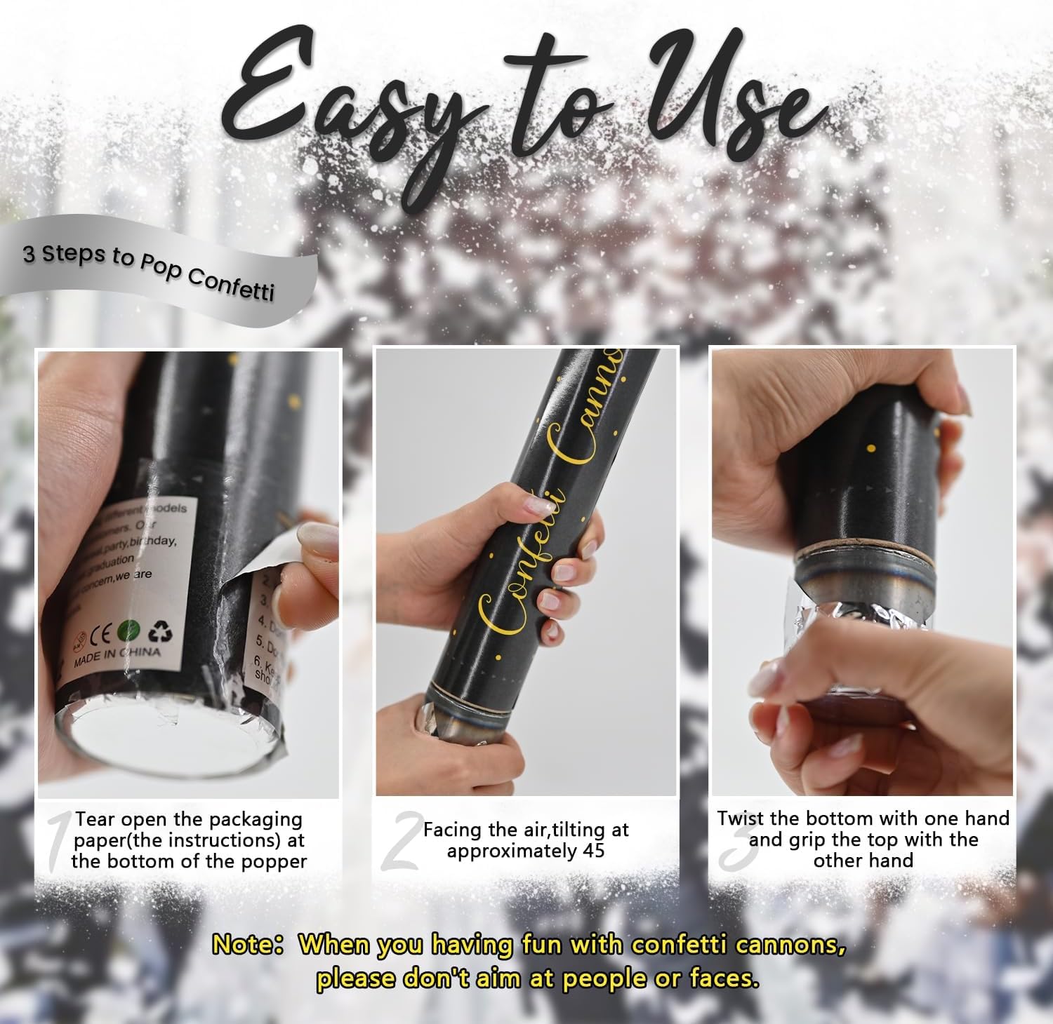 • Before Use Confetti Cannon:In order to provide you with a better experience with confetti poppers and avoid being unable to twist, Please read the instructions and tear open the packaging paper at the bottom of the confetti cannon, then easy to twist it!