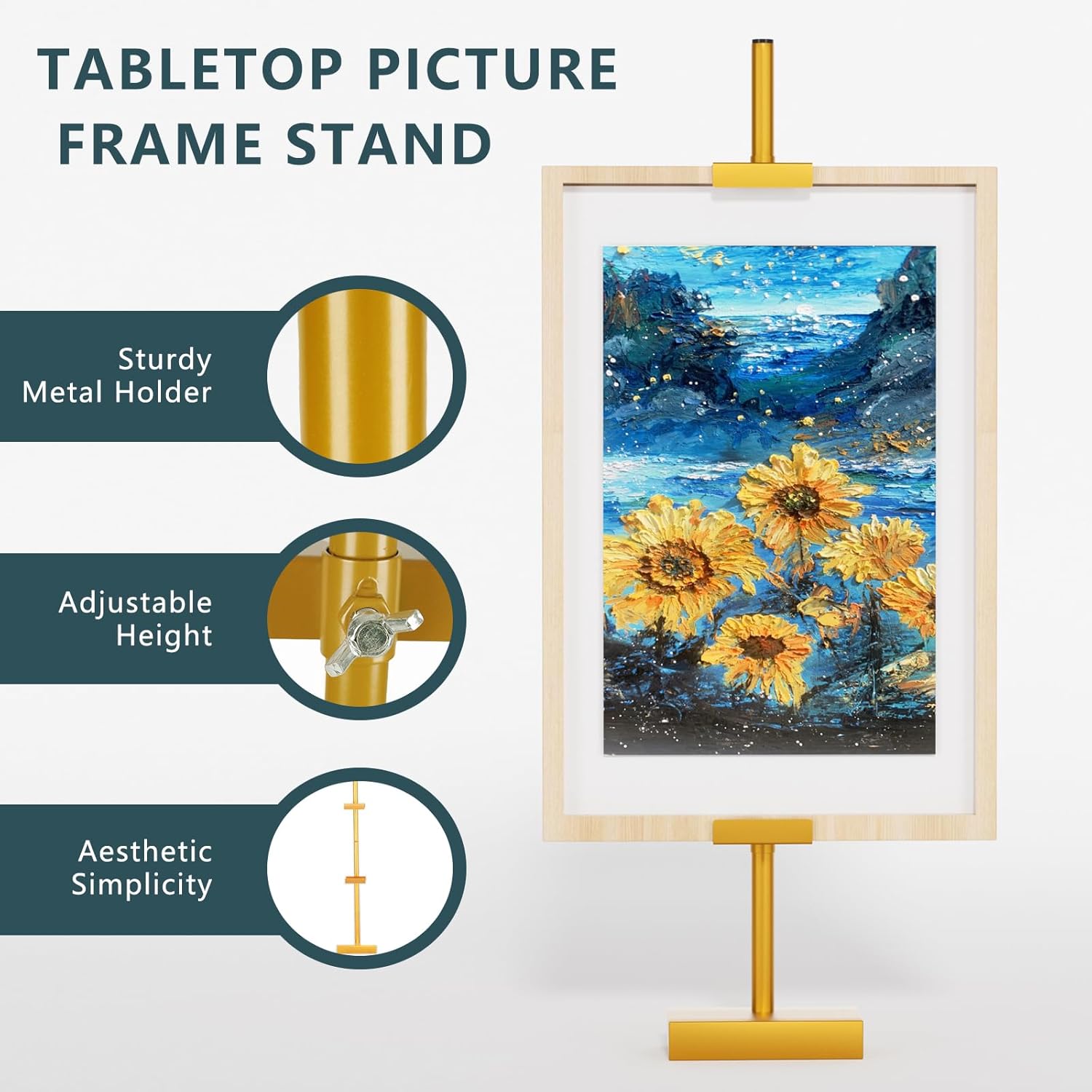 • ADJUSTABLE: Experience the ultimate flexibility in showcasing your artwork and memories with our adjustable art display stand for table. Freely adjustable height to fit your frame(up to 29.5"H, 1.5"D). Note: Please do not overtighten while adjusting to avoid damaging the coating.