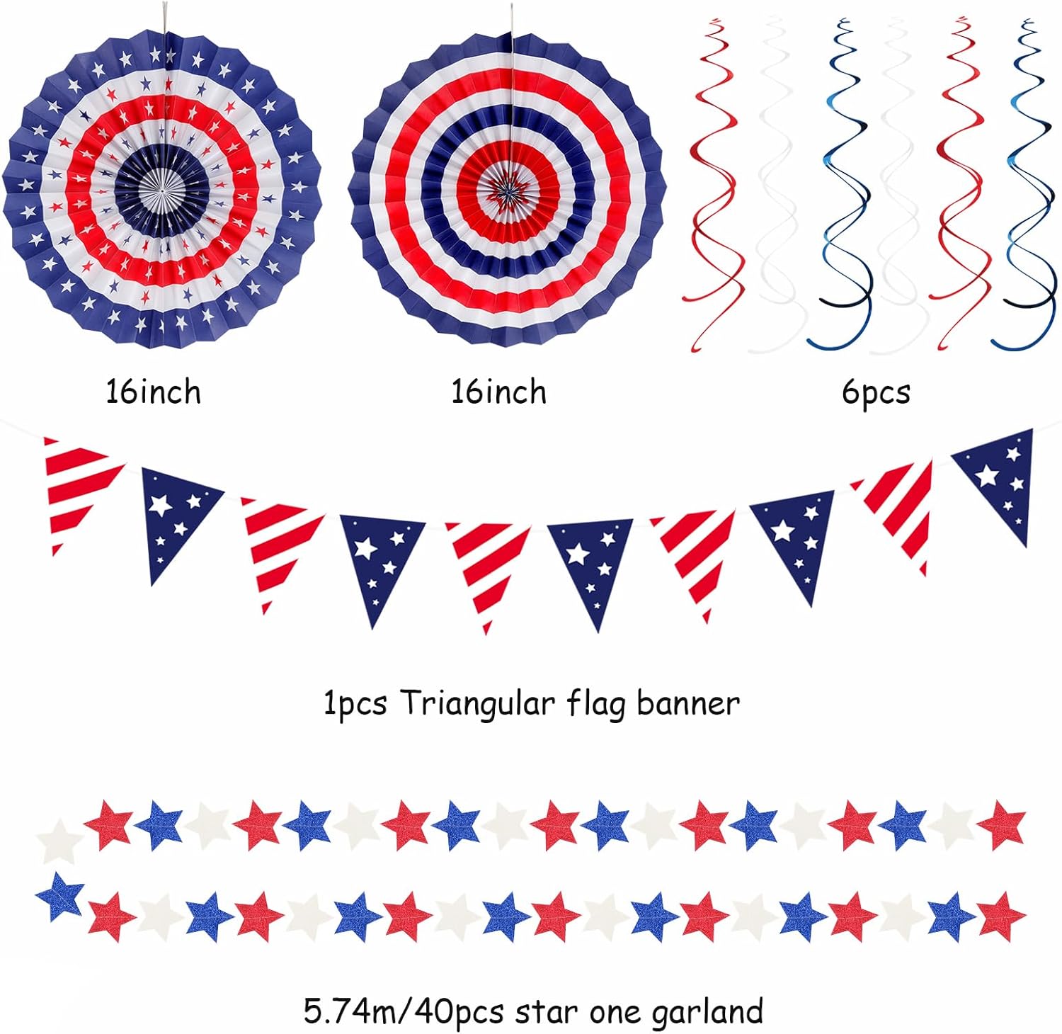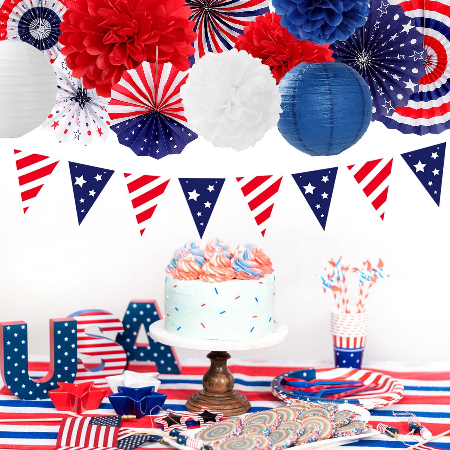 • 【Package Content】Red white royal blue party decorations contains: 1 pcs american pennant banner flags, 1 pcs star garland,3 pcs paper lanterns, 4 pcs tissue paper pom poms, 6 pcs paper fans, and 6 pcs hanging swirls. Total 21pcs in various sizes and colors.