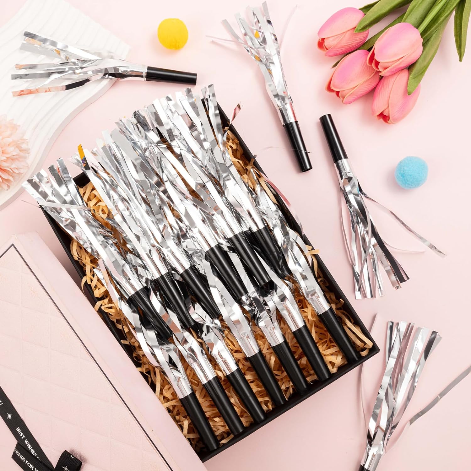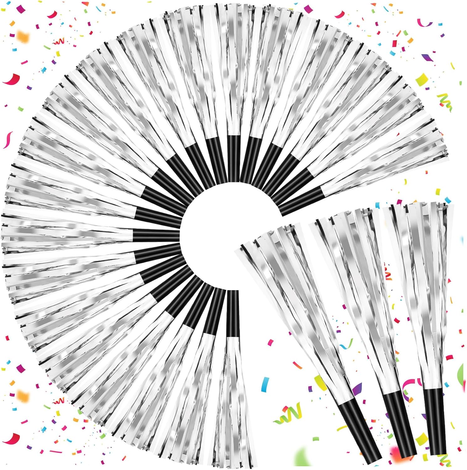 • SAFE TO USE :Our glitter metallic fringed noise makers are easy to use, ensuring a good experience. These party accessories are good for releasing excitement and happiness, creating a lively atmosphere