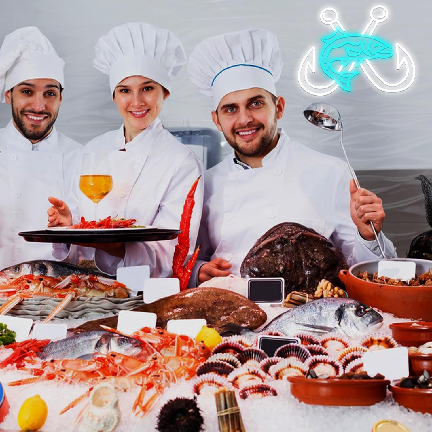 • Fishing neon sign: The crossed fish hook pattern symbolizes fishing activities and is a familiar symbol for fishing enthusiasts. The fishhook and fish are in white and ice blue, adding visual impact. This fish on neon light sign can be used for fishing, Marine activities or seafard-related themes.