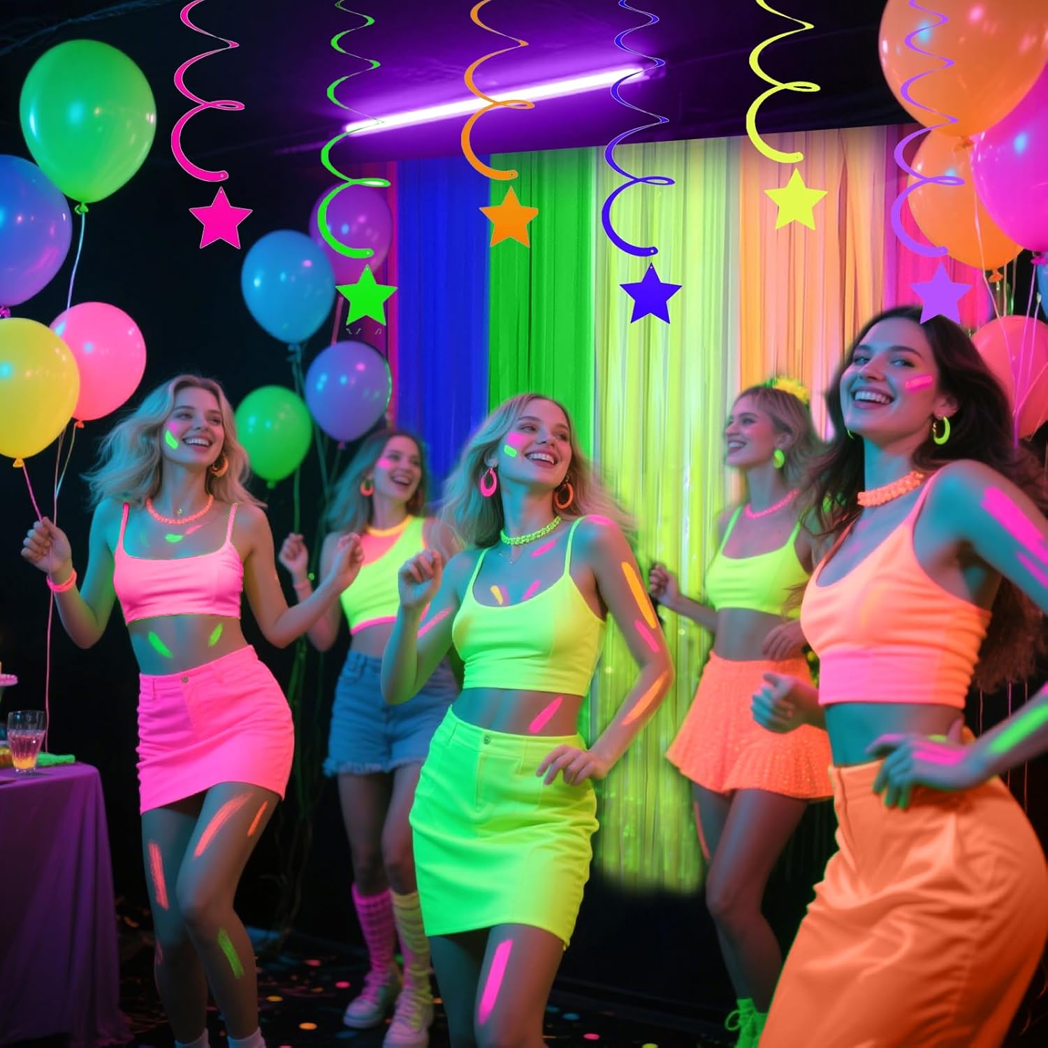 • Glow in the Dark Party Supplies: You will get 4 pcs fluorescent macaron rainbow tinsel backdrop, size: 6.6ft*3.3ft. The foil fringe curtains are perfect for blacklight dark glow party decorations, on the door or wall to create an impressive decoration for parties, events, and photo booths.