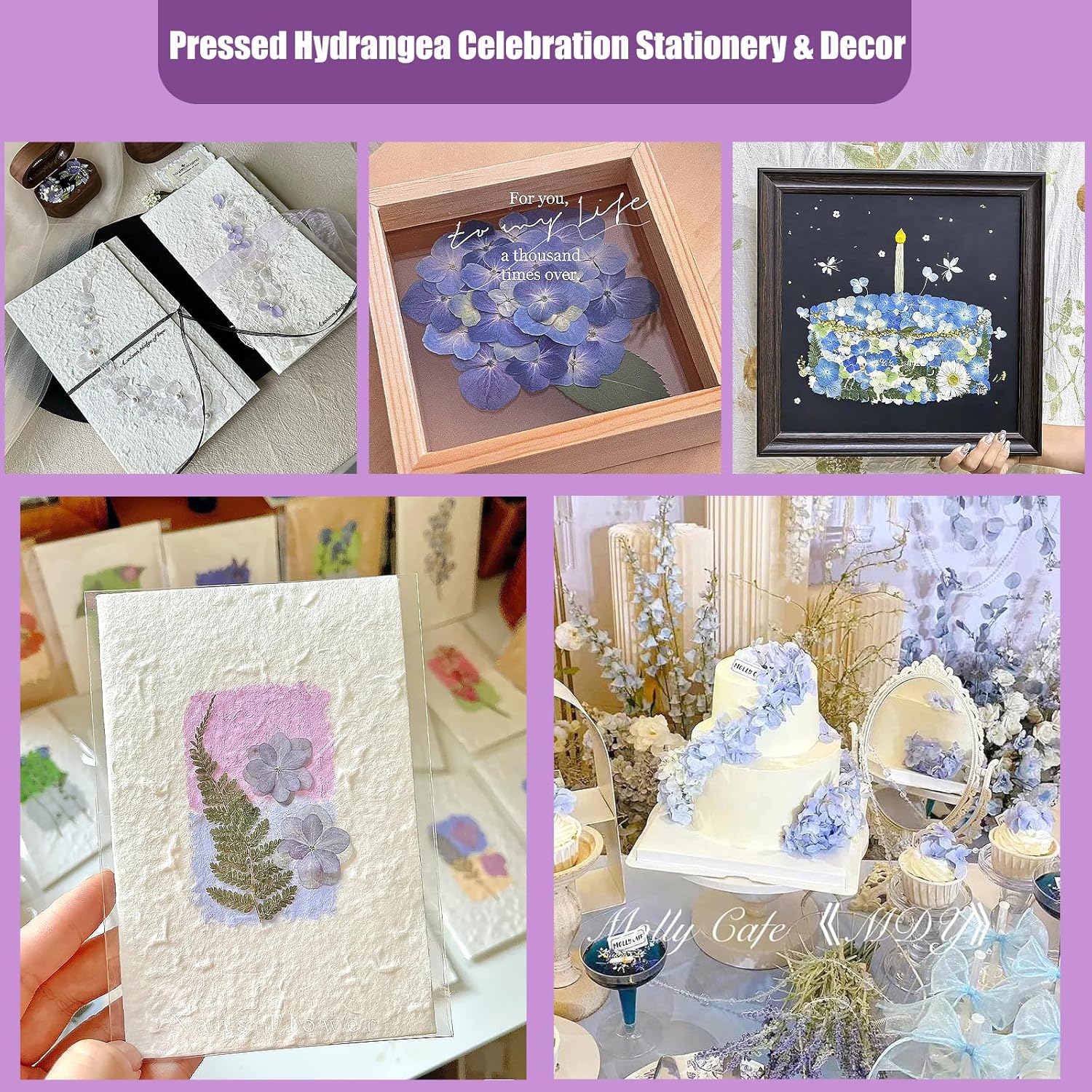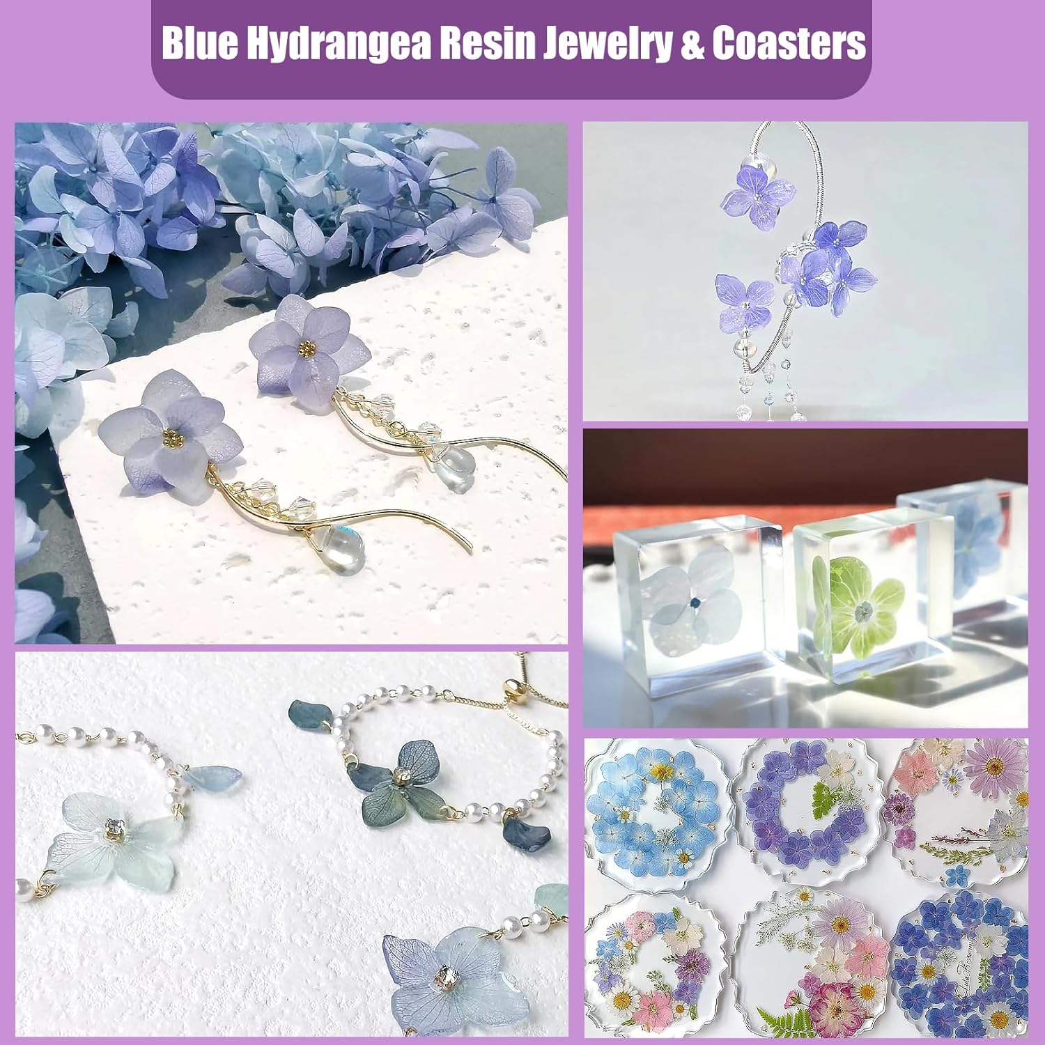 LUXEEASE 140 Pcs Dried Pressed Hydrangea Flowers for Crafts, Real Natural Blooms in Blue, Pink & White Tones with Foliage Accents, Perfect for Resin Art, DIY Jewelry & Home Decor – Tweezers Included