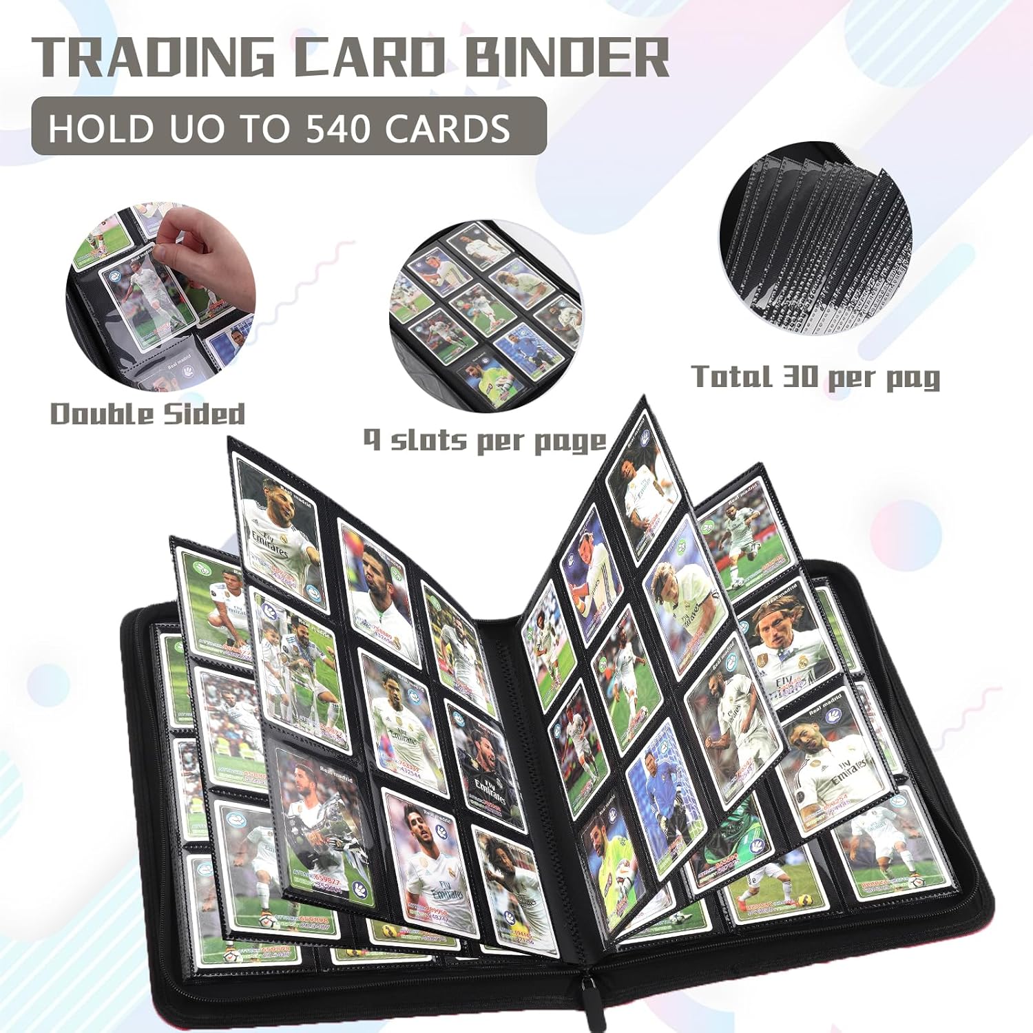 • LARGE CAPACITY CARD STORAGE:Smooth zippered card holder with 9 pockets per page,30 double sided pages hold up to 540 cards,providing plenty of space for card collectors and players to organize their cards