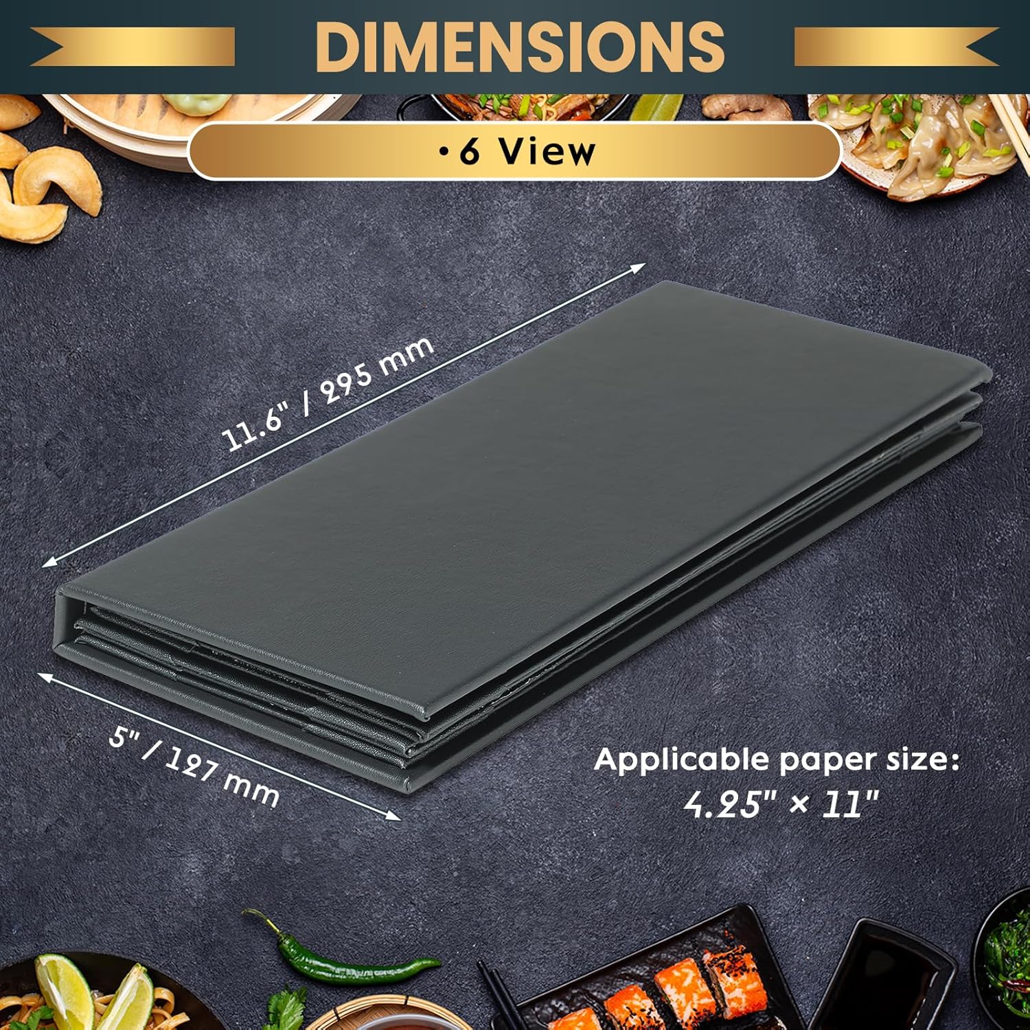 • Specifications: Menu cover size: 5" x 11.6", Applicable paper size: 4.25" X 11". 6 View 12 Pack.