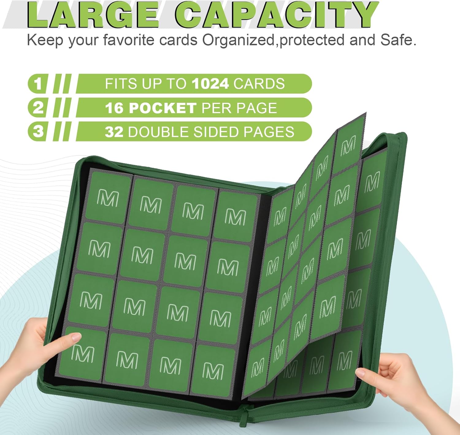 • 【LARGE CAPACITY 】It features an interior suede lining, providing a luxurious touch and ensuring durability.Our card binder holds up to 1024 trading cards with 16 pockets per page,both sides can hold cards,totalling 32 pages.Large storage capacity to meet your card collection needs ,keep all your cards organised.