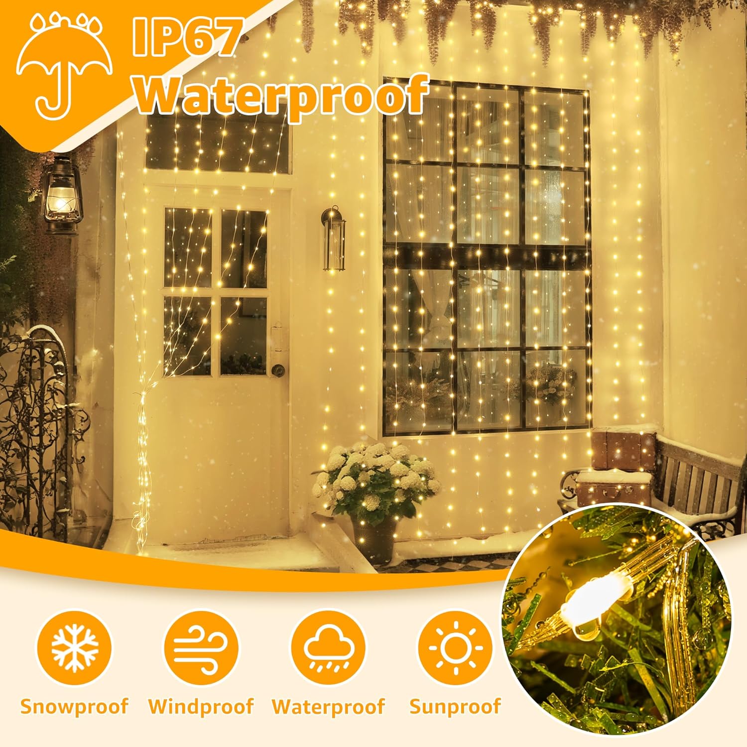 Ollny Curtain Lights 600LED 19.7ft x 9.8ft, IP67 Waterproof Outdoor Curtain Rice Lights with Remote, Plug-in Untangle Rice Curtain Light with 8 Modes 3 Timers for Wall Backdrop Decor(Warm White)