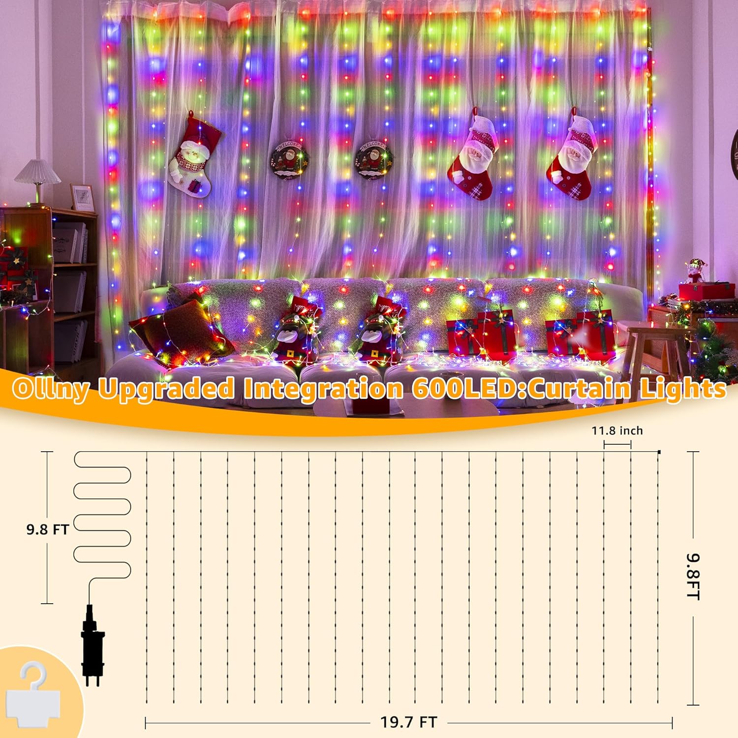 Ollny Curtain Lights 600LED 19.7ft x 9.8ft, IP67 Waterproof Outdoor Curtain Rice Lights with Remote, Plug-in Untangle Fairy Light with 8 Modes 3 Timers for Wall Waterfall Backdrop Decor(Multicolored)