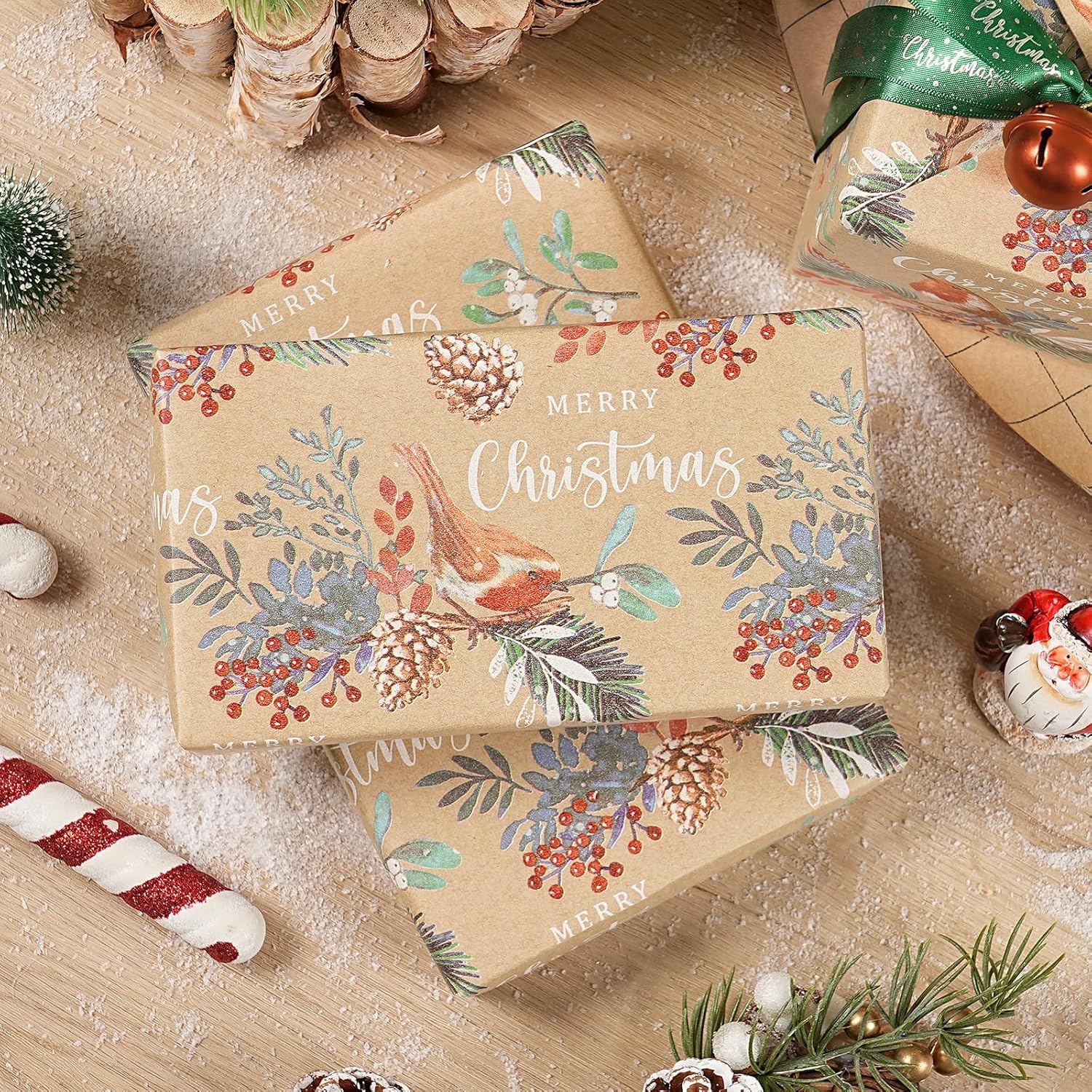RUSPEPA Kraft Christmas Wrapping Paper Roll, Mini Roll, Vintage Bird on Pine Branch Design with Merry Christmas, Natural Scene Gift Wrap for Women, Friends, Family, Xmas Gifts, 17 Inches x 16.4 Feet