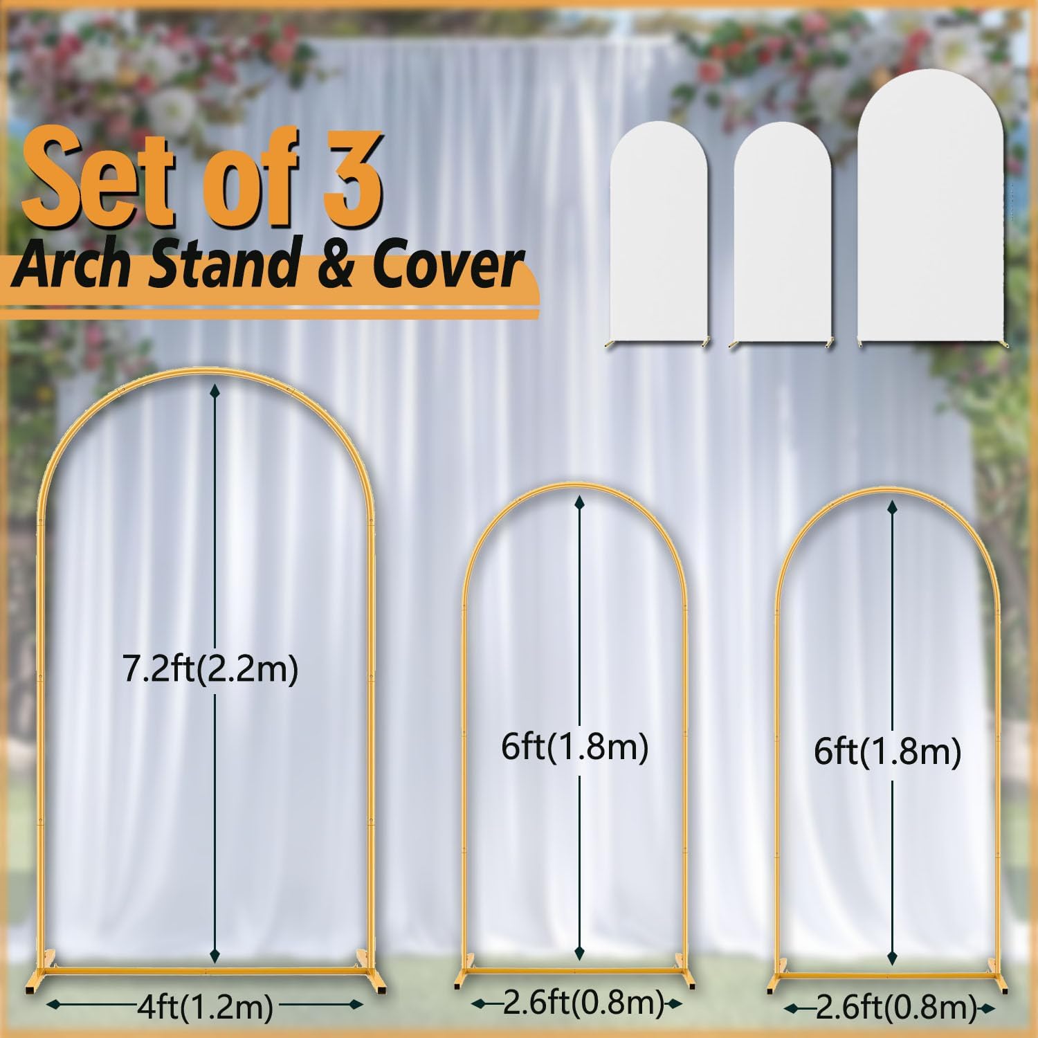 Arch Backdrop Stand Set with Cover,(7.2ft,6ft x 2) Arched Frame Stand & Spandex Wedding Arch Cover & Storage Bag (White, 7.2Ft+6Ft+6Ft)