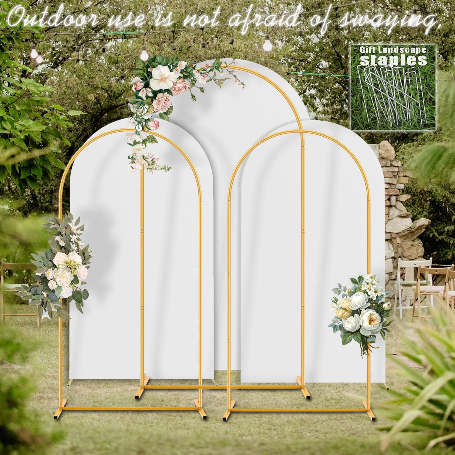 • Arch Backdrop Stand and Covers Set Package contains 3 Gold arches stand for wedding and 3 White Spandex arch backdrop covers with dimensions of 7.2FT and 6FT.x2. A large tote bag,3 x storage bags, A pair of protective gloves,12 Pcs Outdoor Landscape Staples.