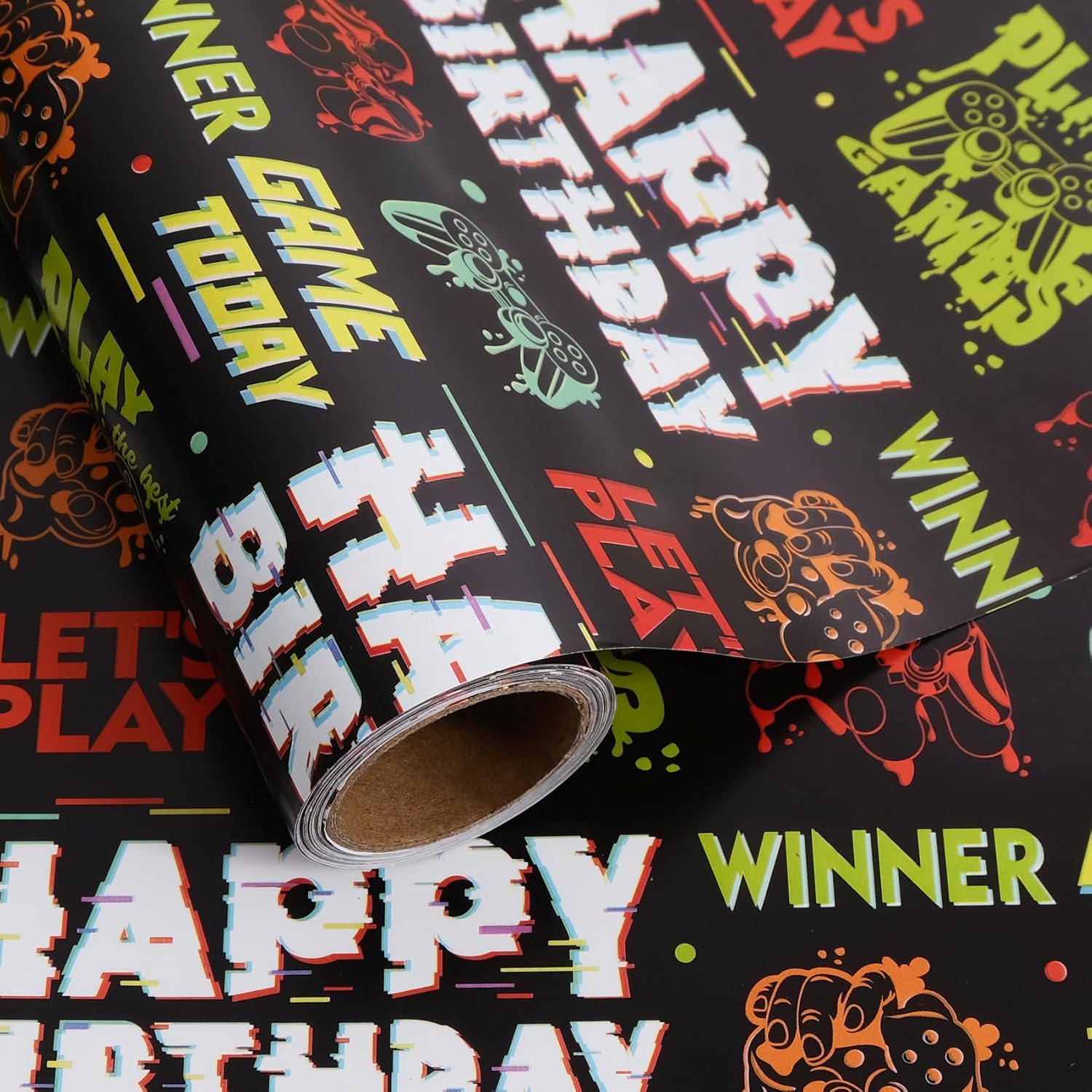 • Happy Birthday Design :This wrapping paper roll with black background, features colorful gaming controllers and "HAPPY BIRTHDAY","GAME TODAY" , "WINNER", "LET'S PLAY", this wrapping paper creates a fun and joyful atmosphere perfect for any celebration