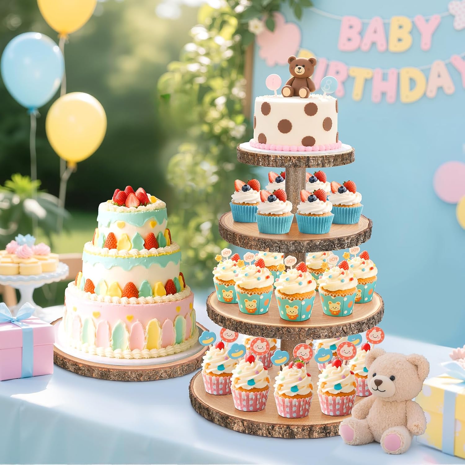 • Rustic cupcake tower : cupcake tier stand Made from natural Paulownia wood, the cupcake stand retains the real bark, and each wooden tray has annual ring wood grain, woodland themed party must haves for hosting