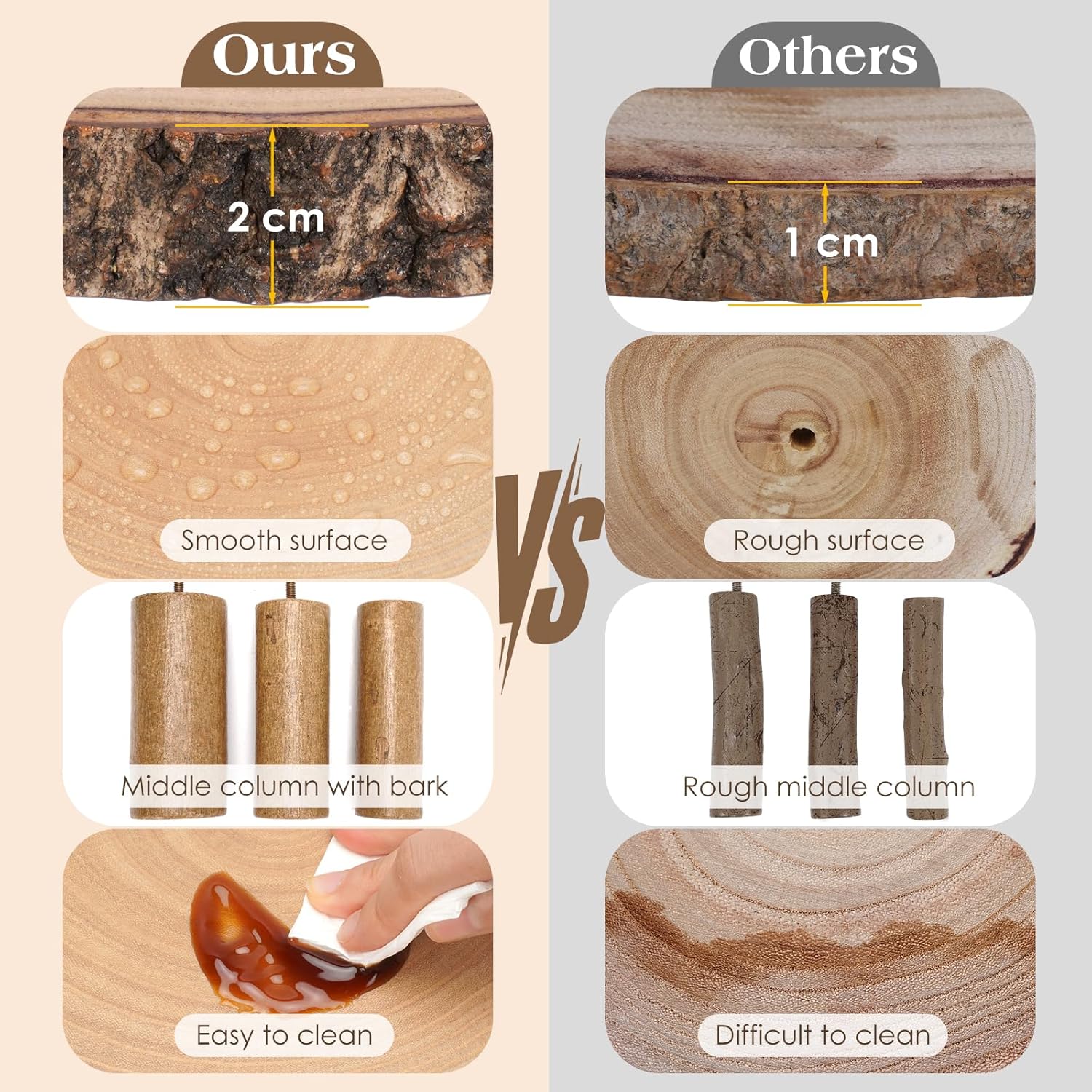 • ark covered center pole: The cake stand is equipped with a thickened bark covered center pole to ensure sturdiness and stability. The center pole can easily link the wood pieces and can be adjusted to customize the number of layers to suit your display needs.