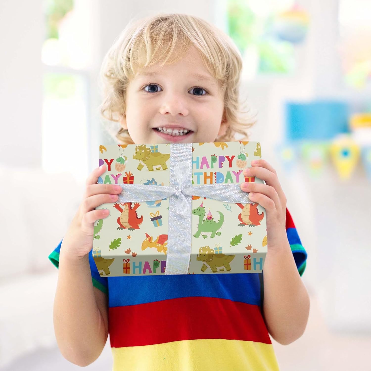• Perfect for Dinosaur Fans :Vibrant green happy birthday wrapping paper featuring roaring dinosaurs, pterodactyls, triceratops, ideal for kids' birthdays, dinosaur-themed parties or dinosaur lovers of all ages
