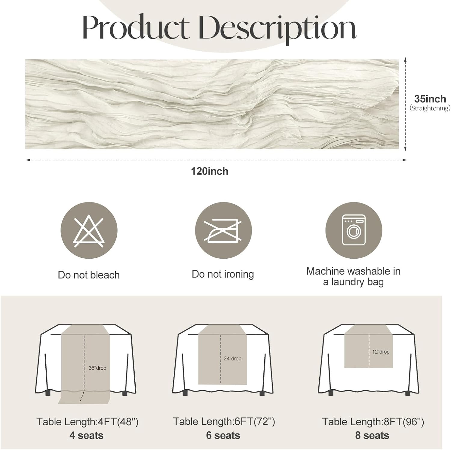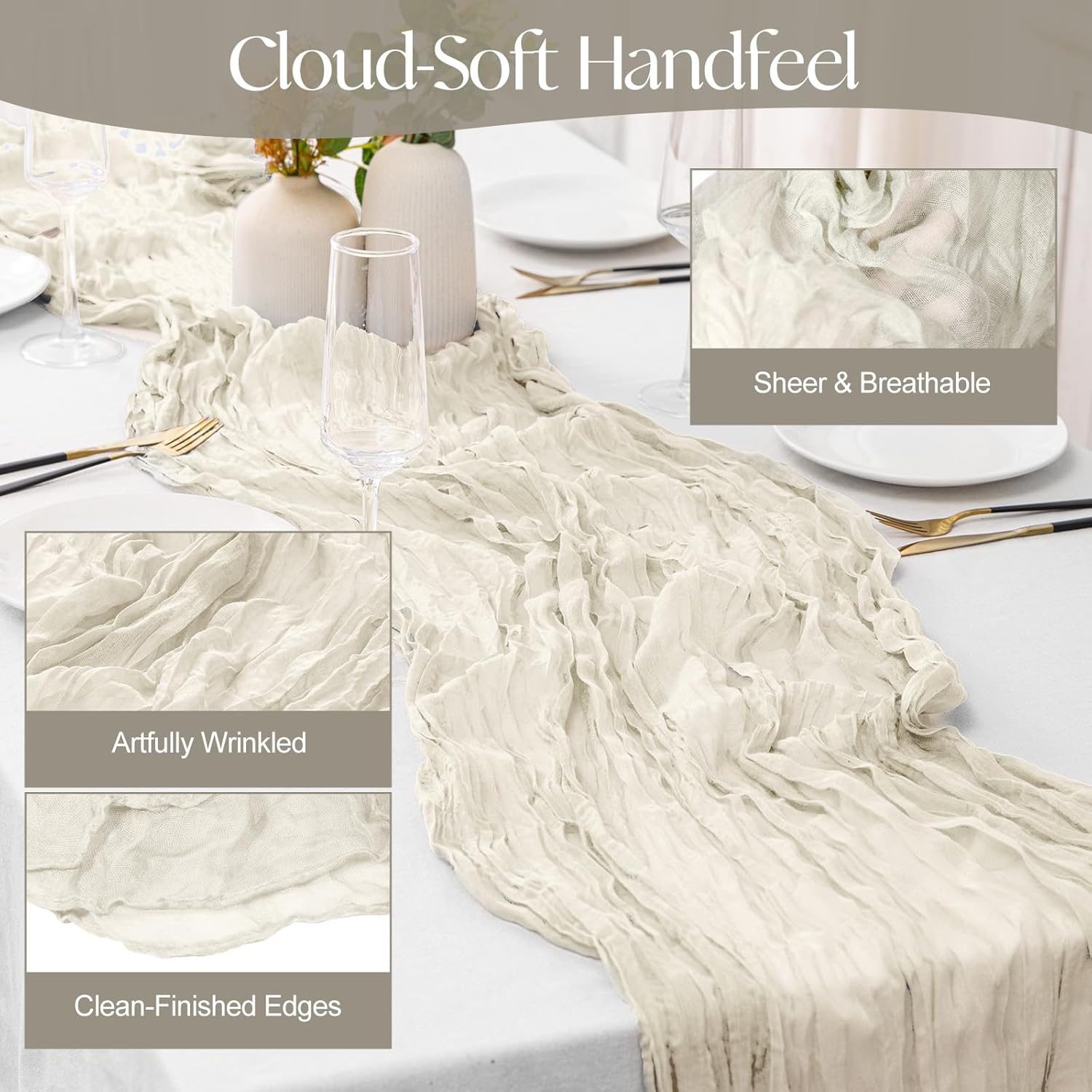 • ULTRA-SOFT CHEESECLOTH FABRIC---Crafted from premium, breathable cheesecloth, this table runner delivers a luxuriously soft texture that instantly elevates table decor. Its naturally wrinkled design adds effortless rustic charm—no ironing required! Perfect for delicate celebrations like bridal showers, baby shower decorations, weddings, birthdays, or holiday gatherings (Easter, Thanksgiving, Christmas).