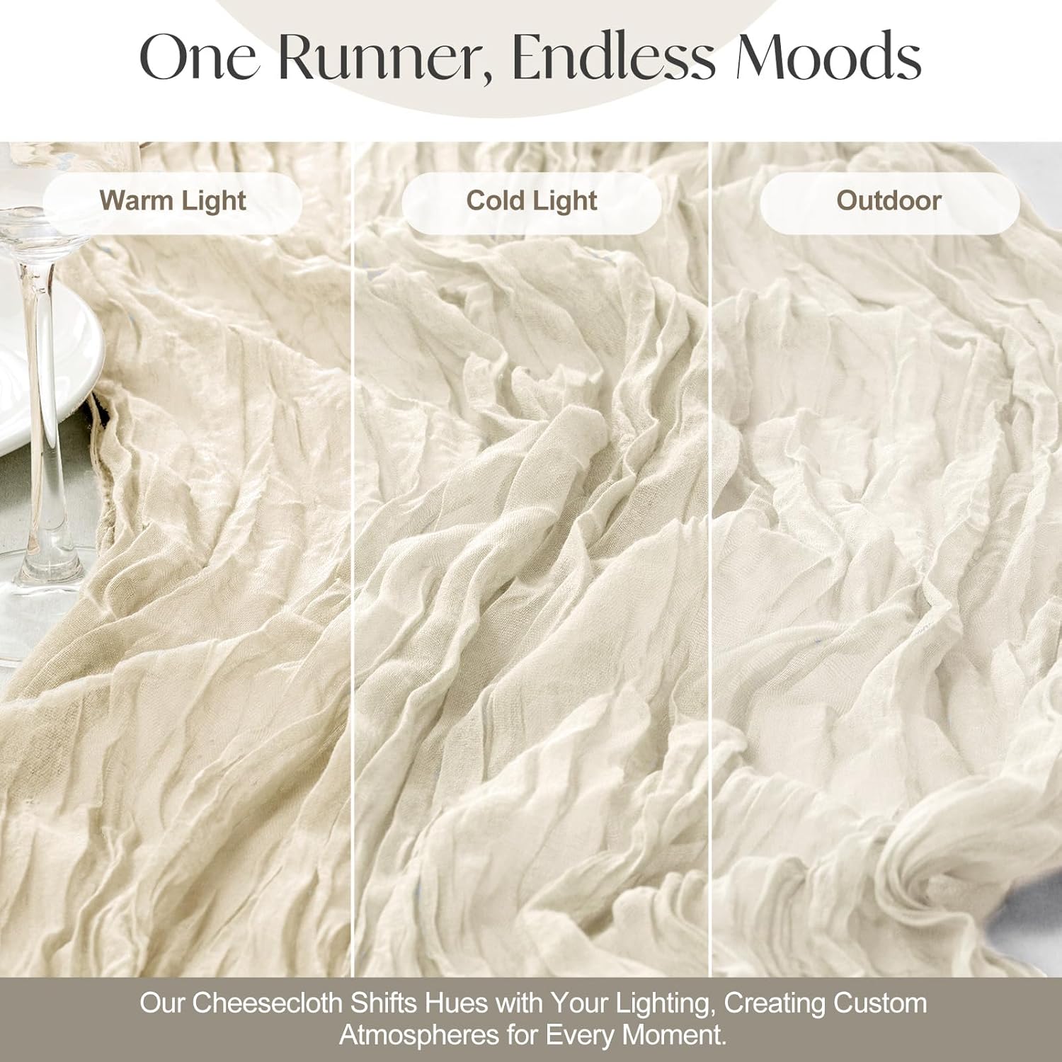 • VERSATILE FOR EVERY OCCASION---Whether decorating a boho wedding arch, a cozy holiday buffet, or an outdoor picnic, this cheesecloth table runner adapts seamlessly. Drape this table runner over banquet tables, fireplace mantels, or dessert bars to create a romantic, flowy vibe. Neutral tones and sheer finishes blend flawlessly with rustic, vintage, or modern themes.