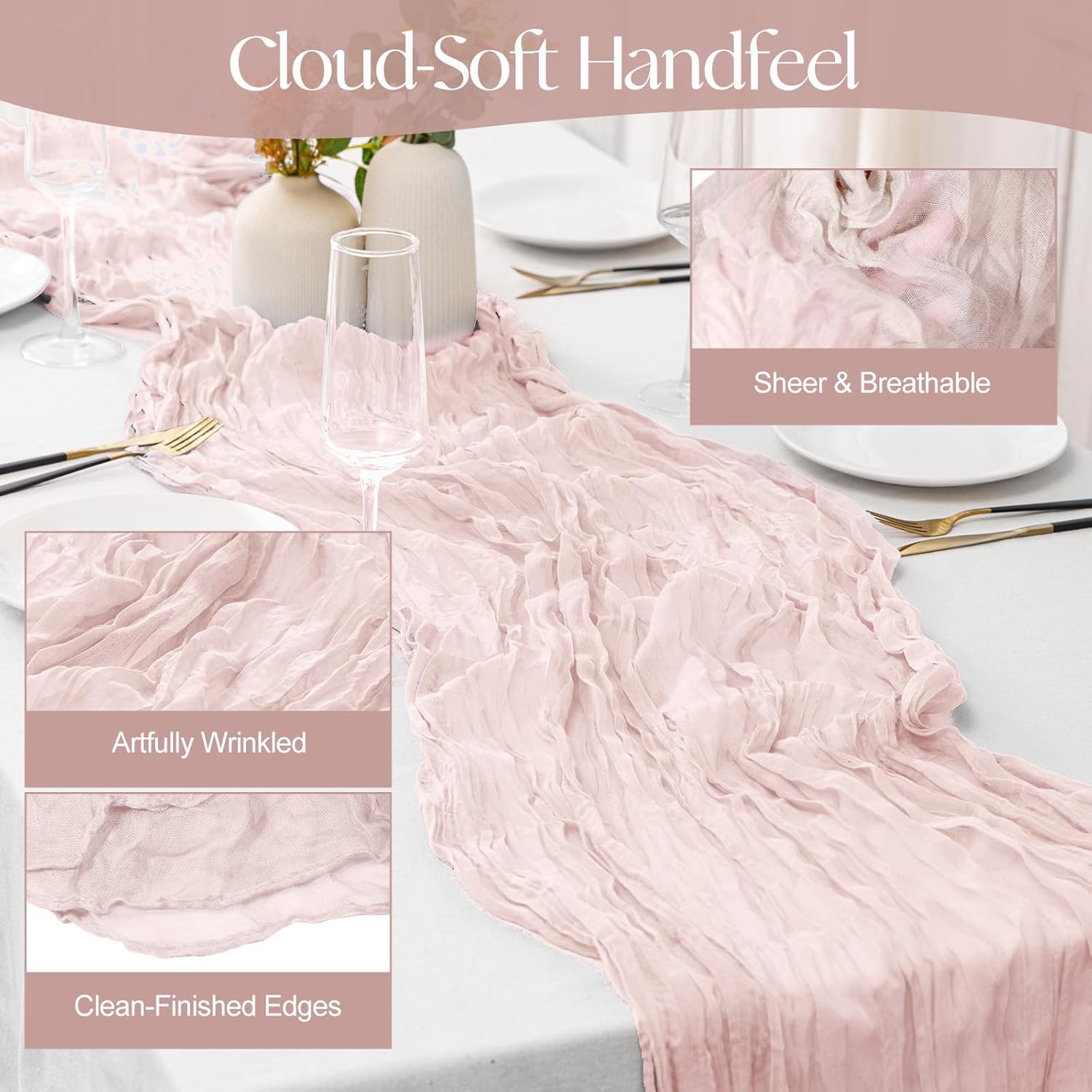 • ULTRA-SOFT CHEESECLOTH FABRIC---Crafted from premium, breathable cheesecloth, this table runner delivers a luxuriously soft texture that instantly elevates table decor. Its naturally wrinkled design adds effortless rustic charm—no ironing required! Perfect for delicate celebrations like bridal showers, baby shower decorations, weddings, birthdays, or holiday gatherings (Easter, Thanksgiving, Christmas).