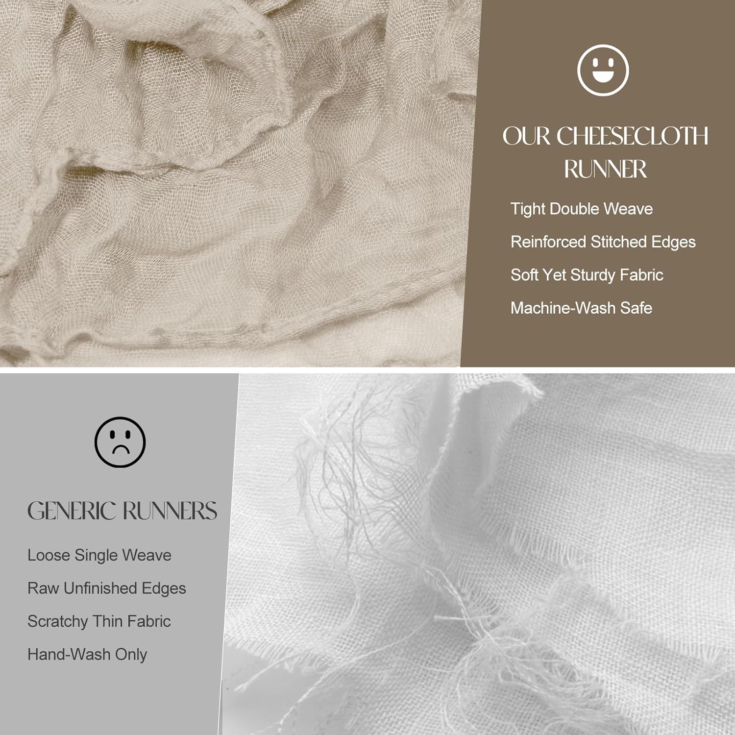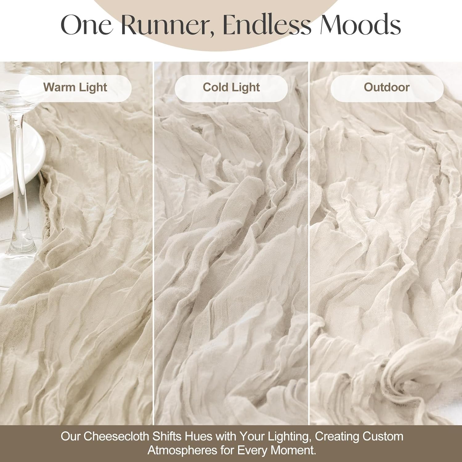 • VERSATILE FOR EVERY OCCASION---Whether decorating a boho wedding arch, a cozy holiday buffet, or an outdoor picnic, this cheesecloth table runner adapts seamlessly. Drape this table runner over banquet tables, fireplace mantels, or dessert bars to create a romantic, flowy vibe. Neutral tones and sheer finishes blend flawlessly with rustic, vintage, or modern themes.