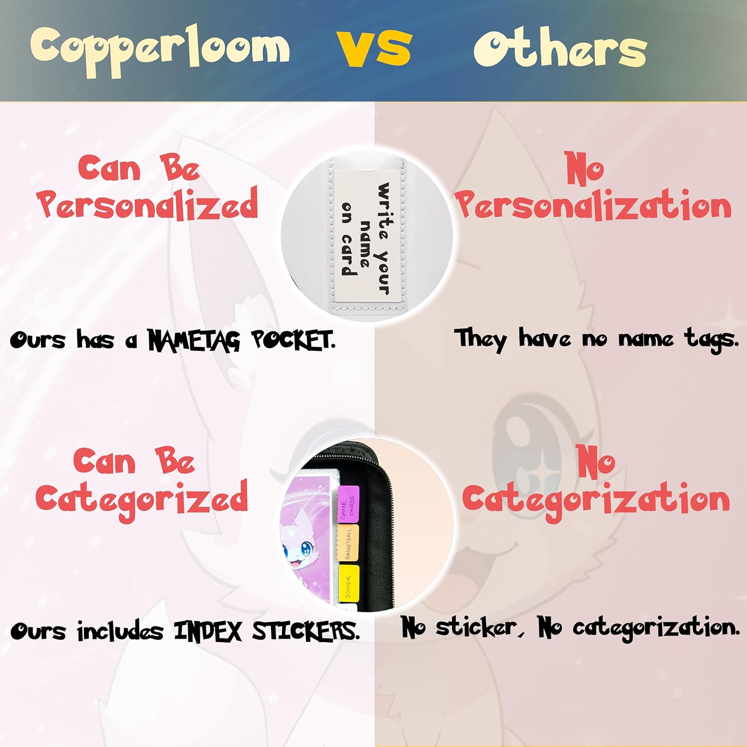 • 【MULTIFUNCTIONALITY 】- The Copperloom card book can be used as baseball cards binder, photocard binder, football card binder, basketball card binder, soccer card bincer, sports card binder, hockey card binder, tcg card binder, card collection binder, trading card holder, card storage display case, kpop binder, 4 pocket card binder, gift card binder, seed organizer storage, money saving binder, sticker binder, business card binder.