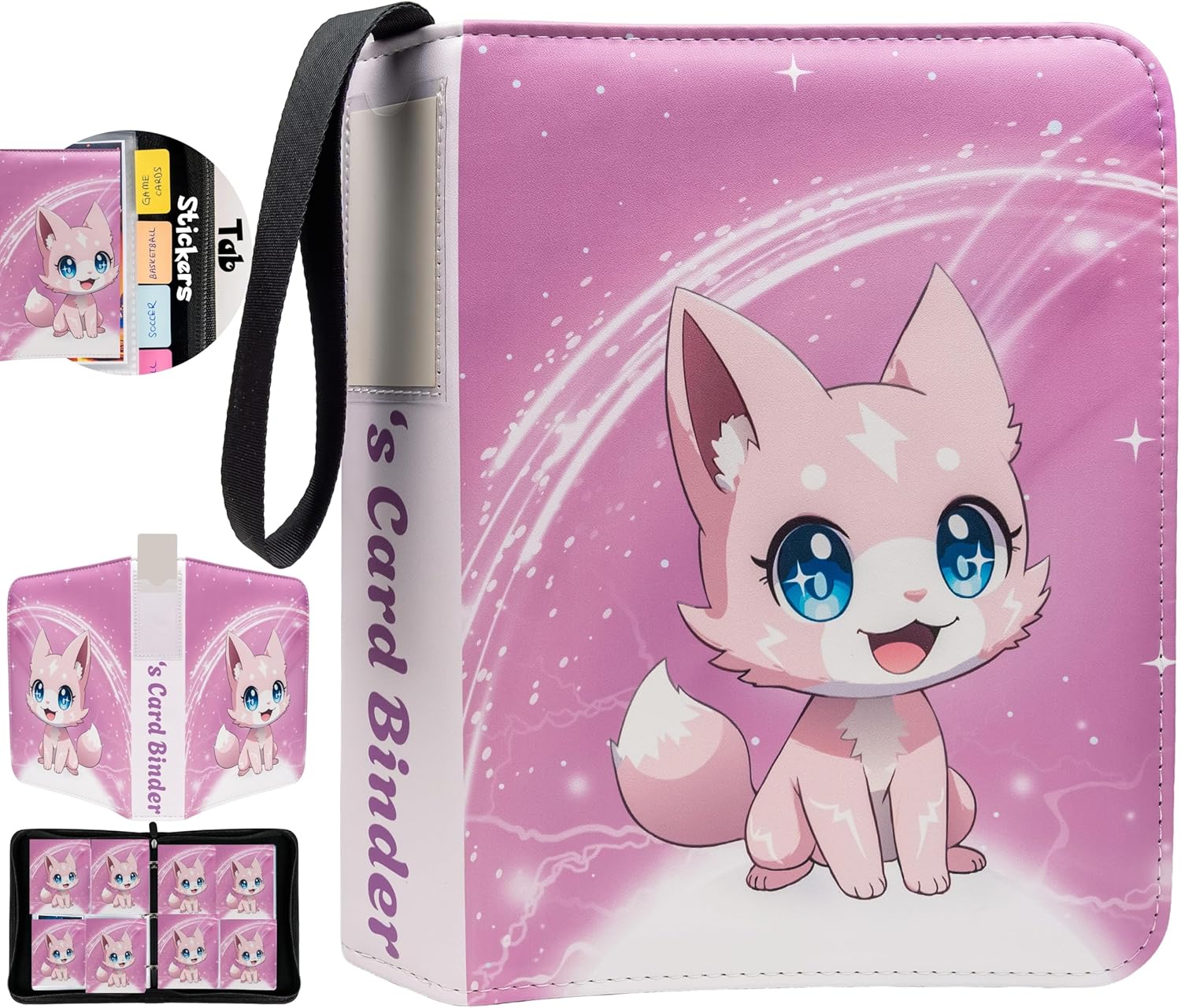 Cute Pink Trading Card Binder 4 Pocket for Girls Gifts - Includes Name Tag & Tab Stickers for Sorting - 440 Pockets Card Binders Zipper Album Book Holder - Baseball Football Sports Tcg Card Case