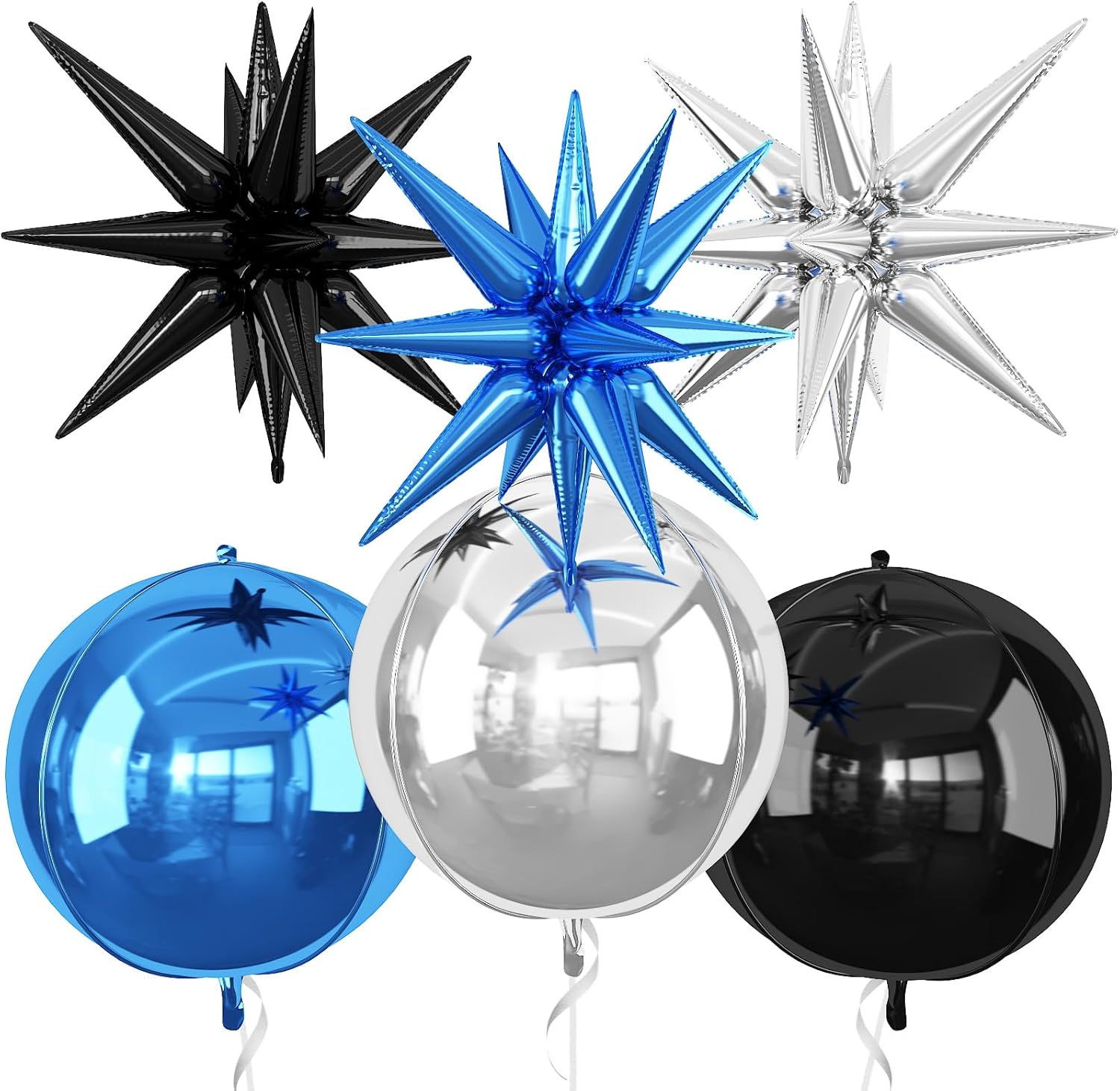 • 【Package】The package includes 3pcs 22Inch 4D ball foil balloons(black x 1,blue x 1,silver x 1),3pcs 22Inch star foil balloons(black x 1,blue x 1,silver x 1),and ribbon.These huge balloons can help you decorate your party better.