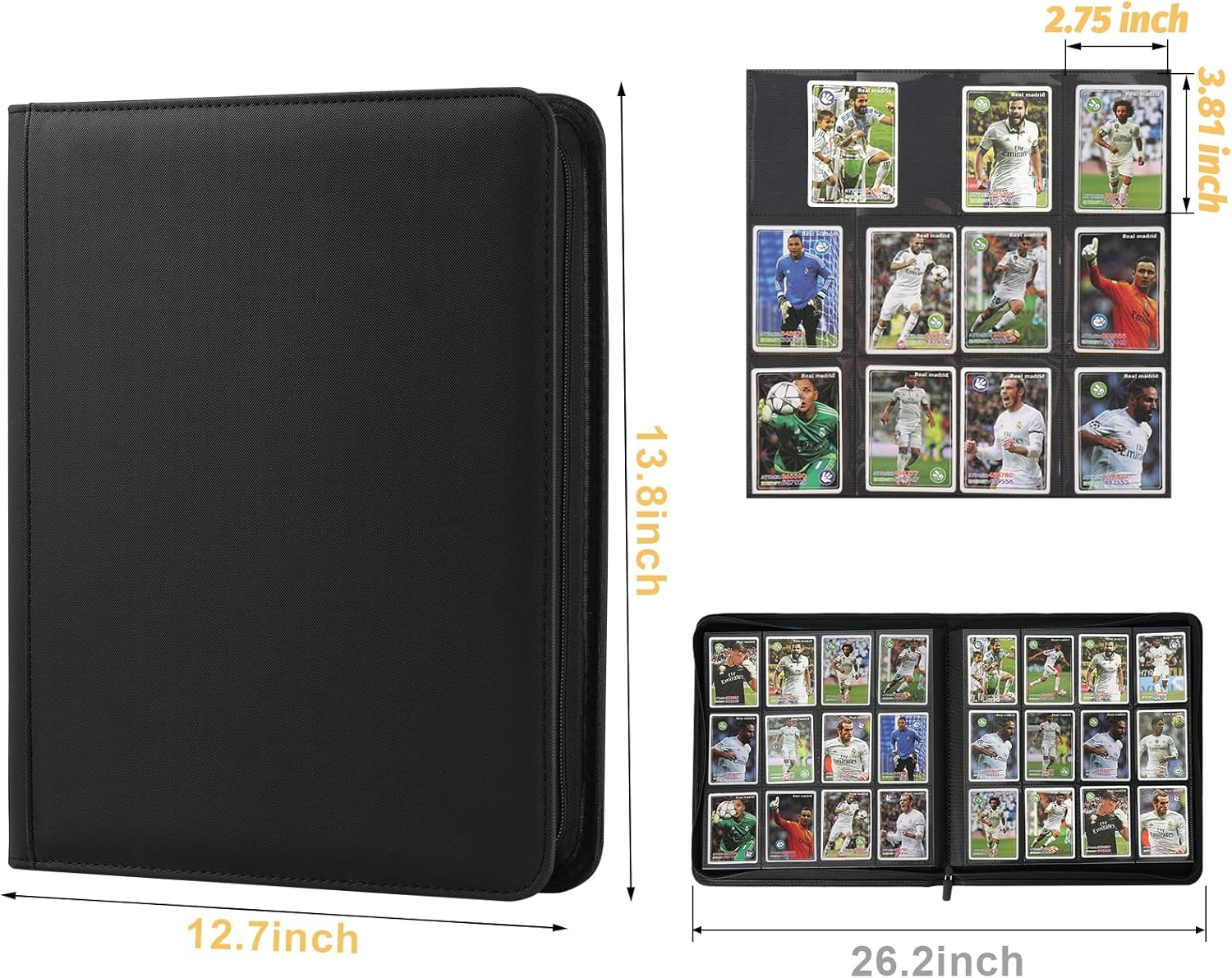 • 【Perfect Build】 Holds 720 trading cards with 30 pages 12-pocket bound to the spine, providing plenty of space to get all your cards organized.binder built without rings. No more worrying about rings damaging your cards, along with a zippered closure for extra protection.Side Loading designed to prevent cards from easily falling out.