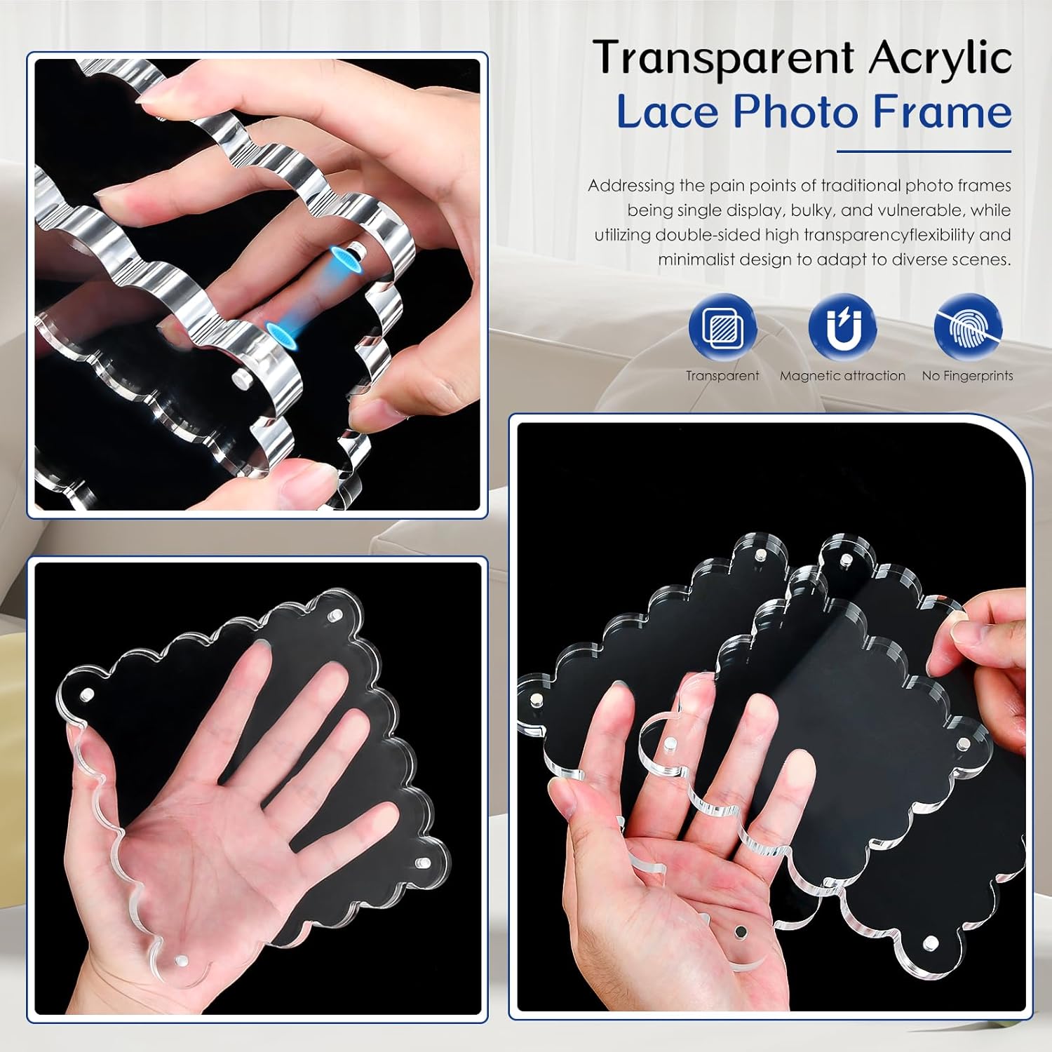 • 【Magnetic Design with Scalloped Edges】 Patent-pending dual-sided magnetic closure system in our acrylic picture frame combines vintage charm with modern functionality. The scalloped picture frame's dimensional edges enhance photo displays while magnets allow instant artwork swaps without compromising security.