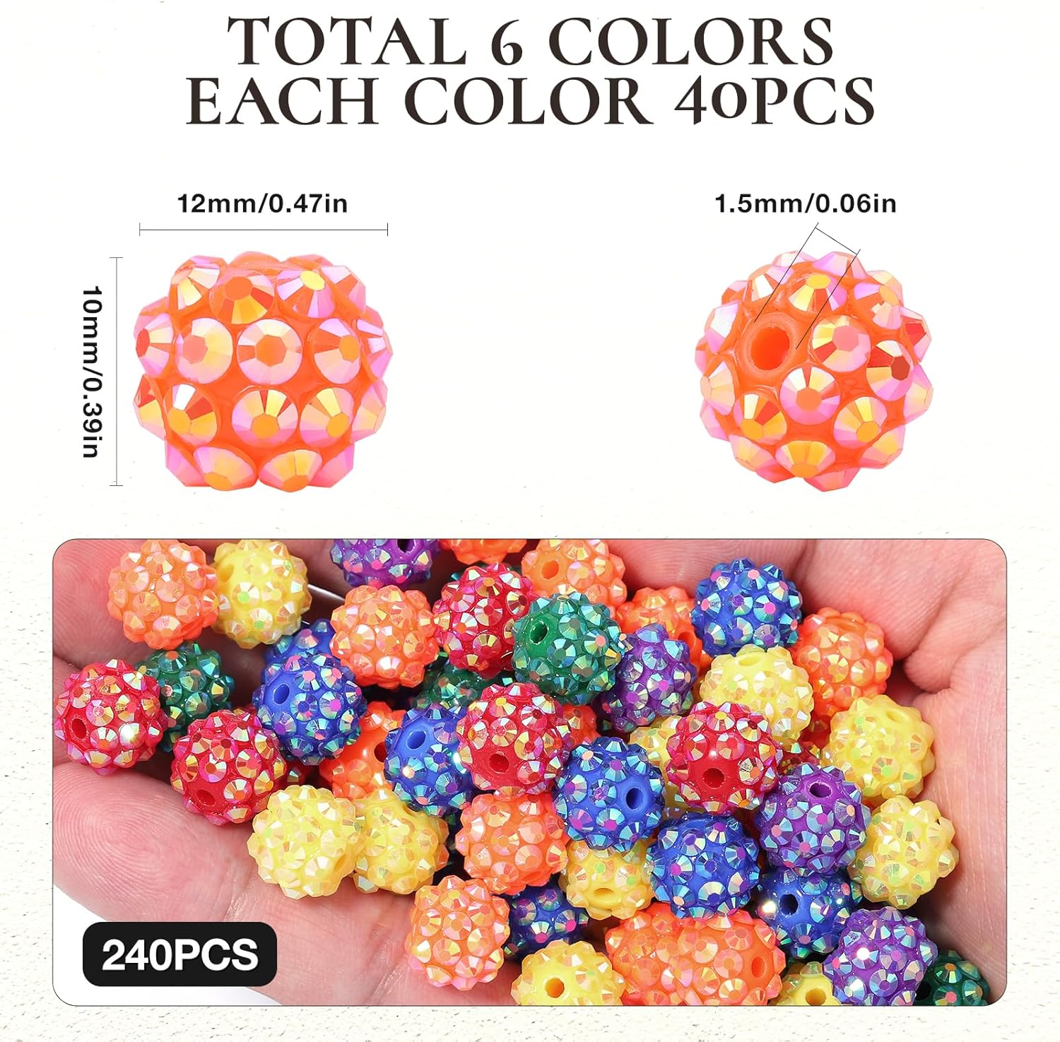 • PACKAGE INCLUDES: 240 rhinestone beads, with a diameter of about 10mm and a hole of about 1.8mm, evenly distributed in a 24-grid plastic storage box. The set is mainly in rainbow tones and includes six AB-color resin rhinestone balls. There are 40 beads in each color to meet the needs of handicrafts.