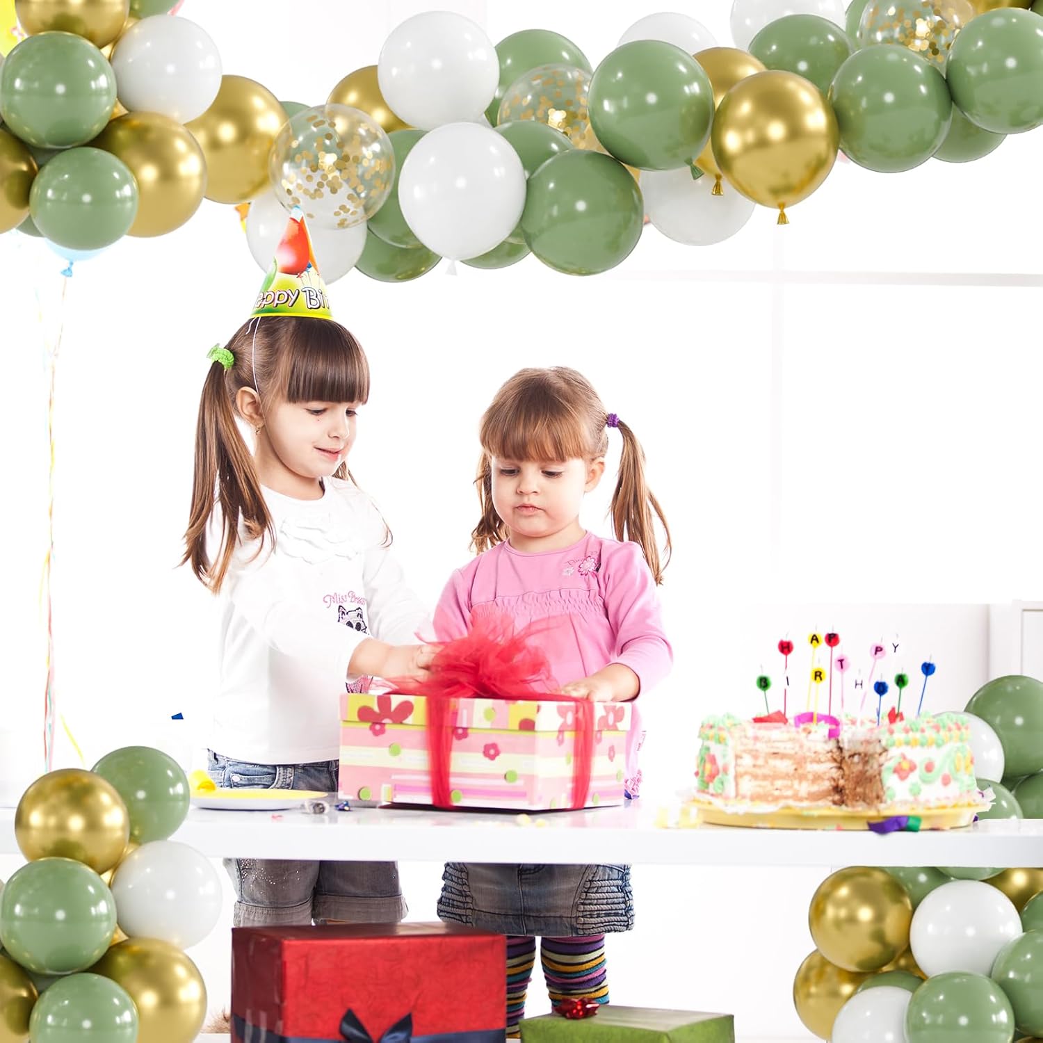 100pcs Sage Green & Gold Balloons Kit - 12 Inch Matte Olive Green, White and Metallic Gold Confetti Balloons for Boho Wedding, Baby Shower, Birthday, Graduation (66ft Ribbons)