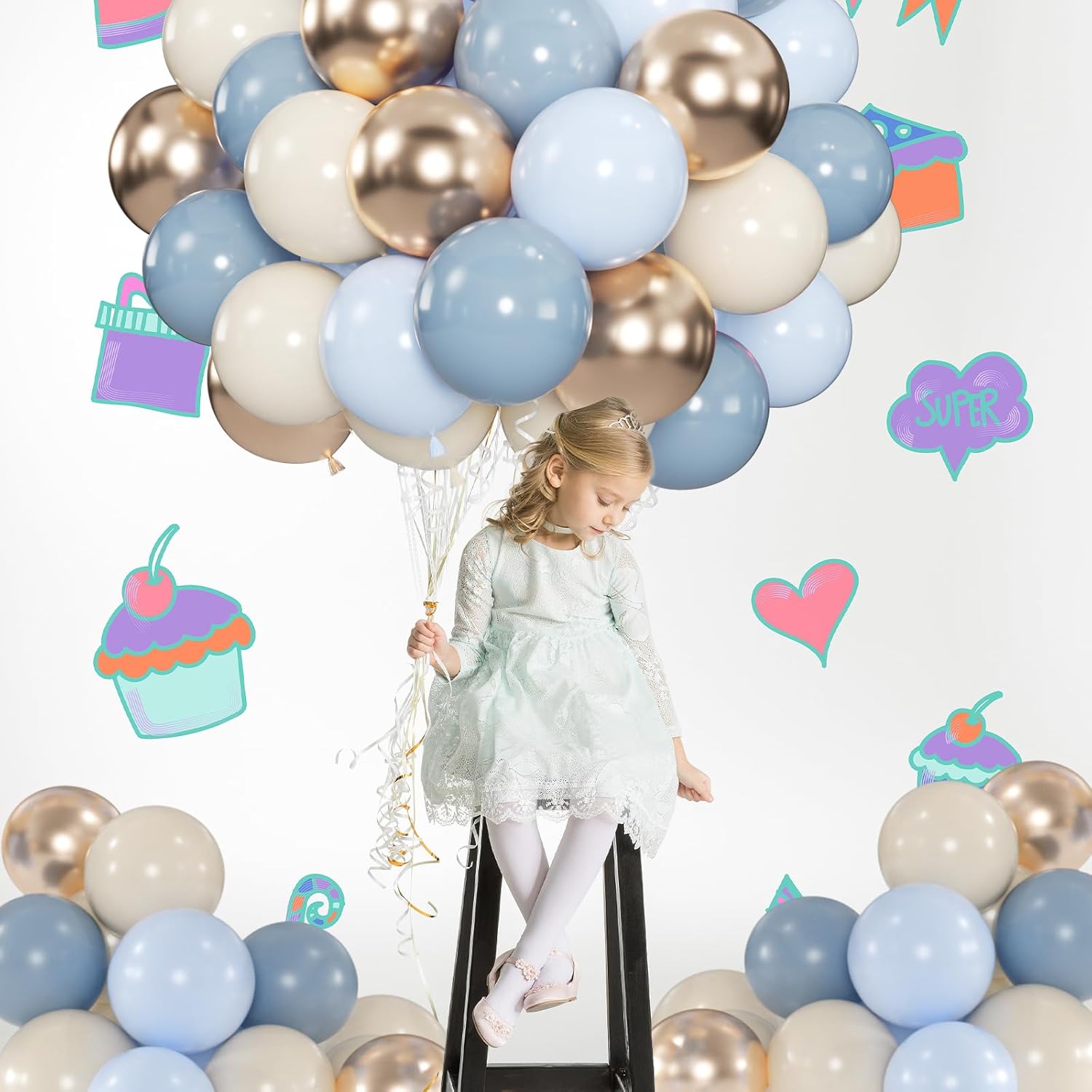 • Curated Twilight Color Palette : 100 premium 12” dusty blue and gold balloons kit (30 retro dusty blue balloons, 25 fog pastel blue balloons, 25 sand white balloons, 20 metallic champagne gold balloons) + 2x 33ft ribbons. Create ethereal boho arches or photo walls!