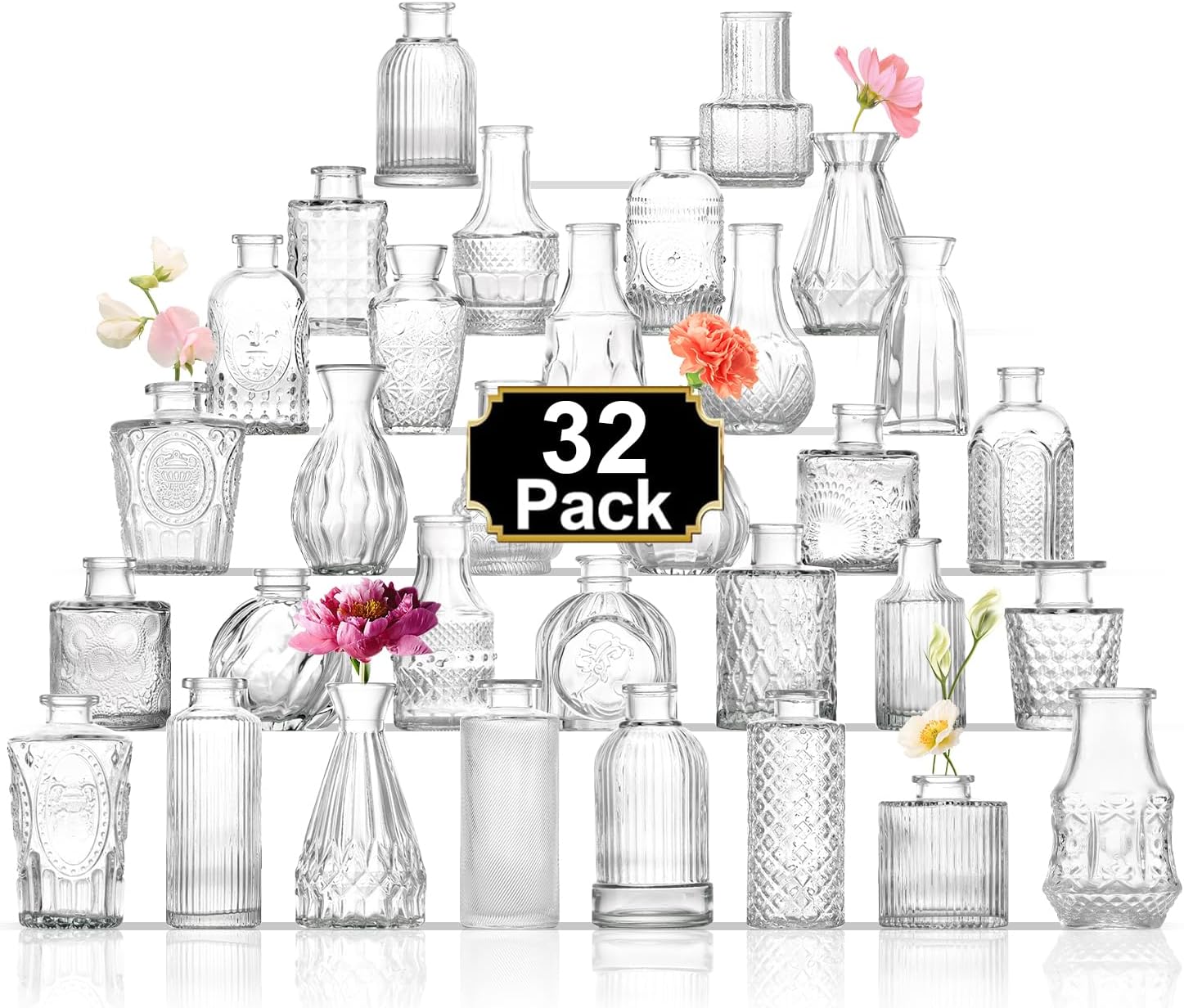 Bud Vases in Bulk 32, Clear Glass Bud Vases for Centerpieces, Small Vases for Flowers, Mini Vintage Flower Vase for Centerpieces, Wedding Table Decor, Home Decor
