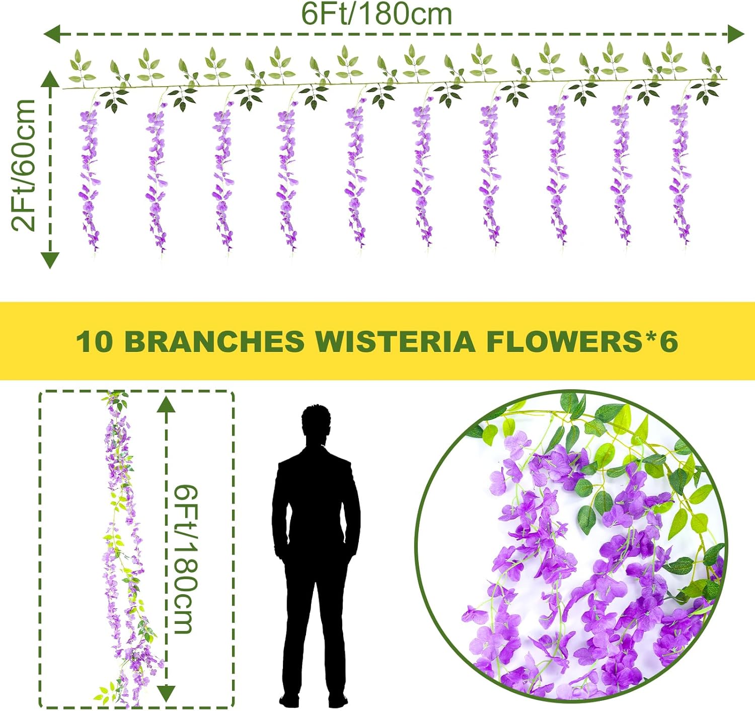 • Material:The artificial wisteria flowers are made of silk and have a silk-like touch. And these hanging flowers have plastic stems and metal wires, can be bent at will, you can bend according to your own needs to get the decoration you want.