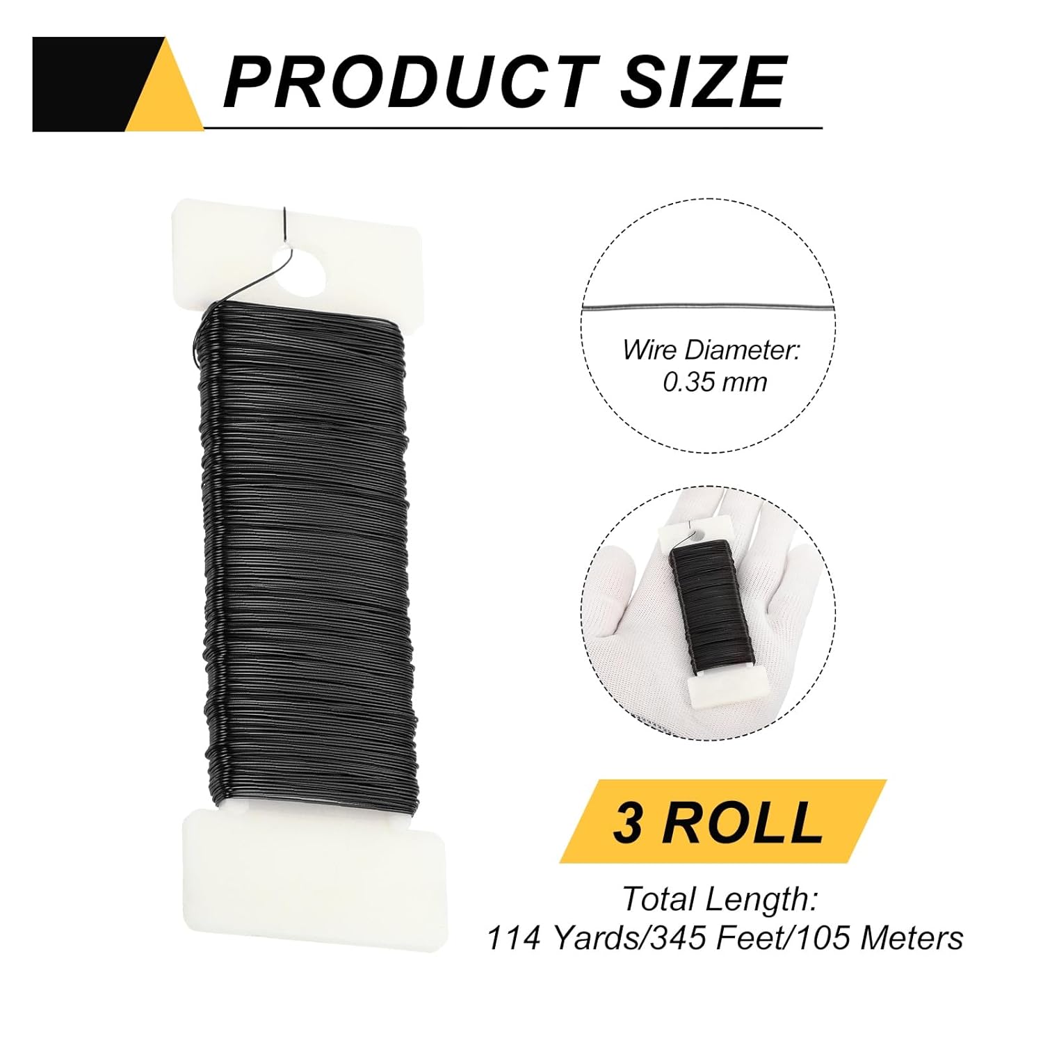 • Color: Black; Material: Aluminum; Total Length: 114 Yards/345 Feet/105 Meters; Diameter: 0.35mm/27 Gauge; In the package of: 3 Roll Metal Floral Wire (38 Yards/ Roll)