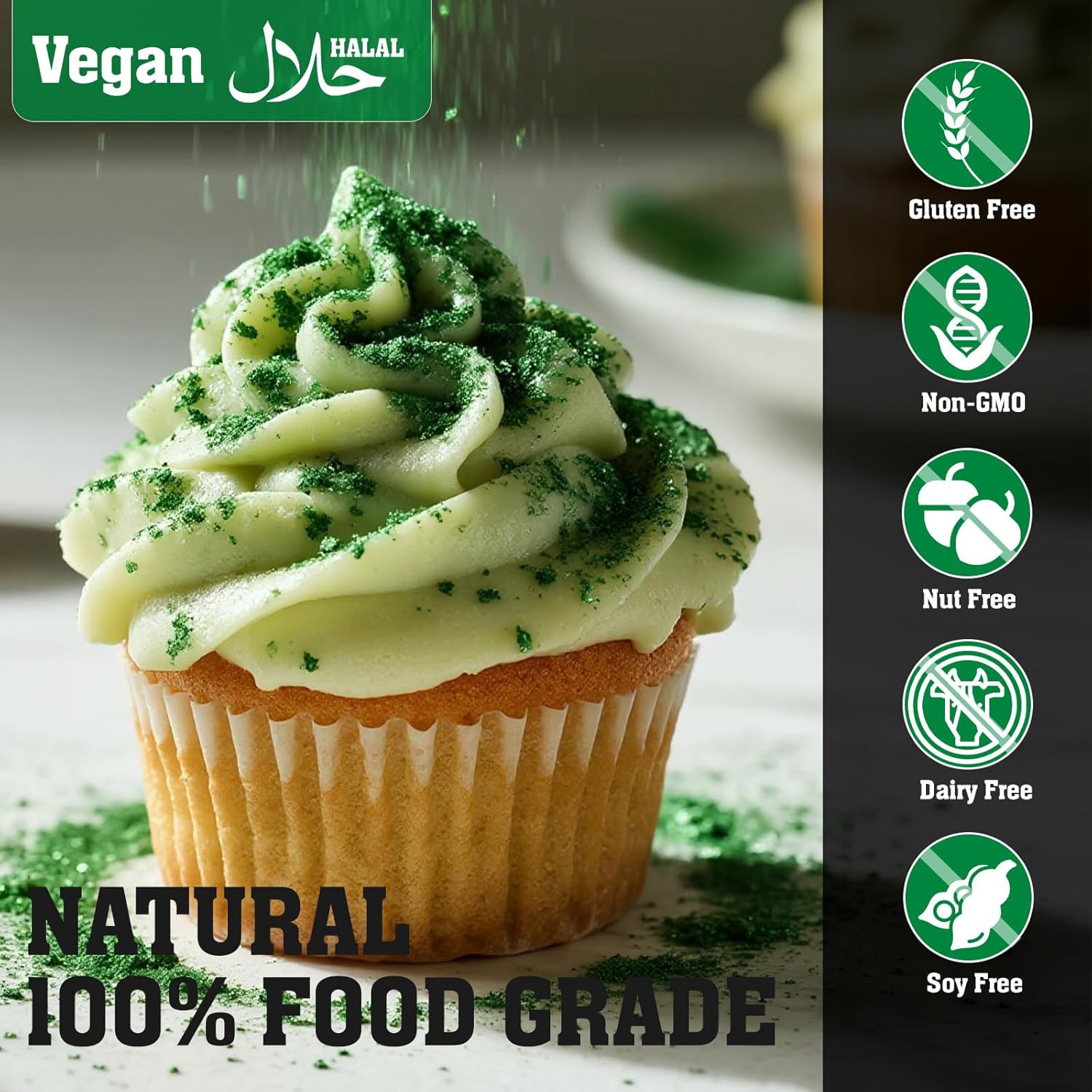 • 【Easy to Use & Versatile】: The edible glitter can simply apply dry with a brush, or mix with alcohol, lemon extract or oil-based flavorings for spray or brush application, or even mix into beverages. These edible luster dust is perfect for decorating frosting, fondant, whipped cream, cocktails, mocktails, champagne, and chocolates with a stunning Green shimmer effect.