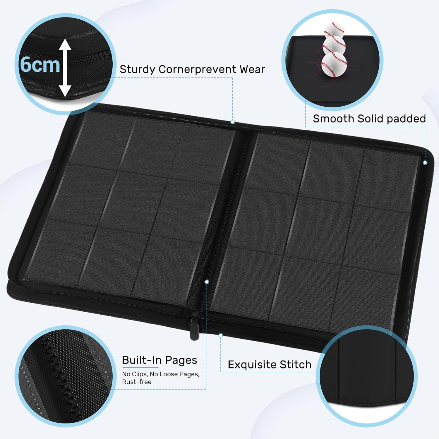 • Maximum Protection: Designed with thickly padded, ultra rigid exterior case to prevent card bending, and durable zipper for further protection from dust and dirt. This water-resistant card binder with premium PU textured faux leather offers trusted durability and superior security for your cards.