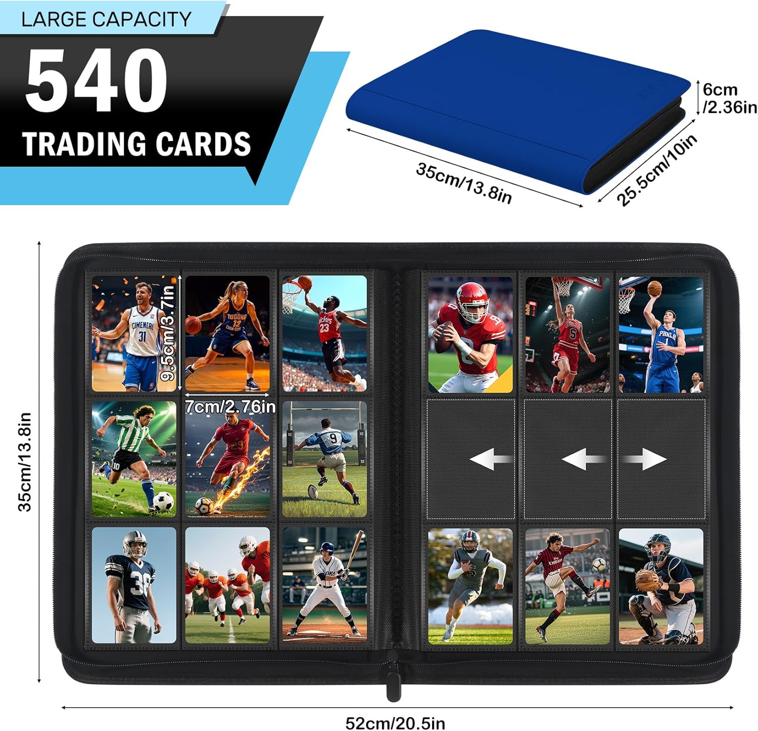 • Large Capacity: Zofly 9 pocket trading card binder is double sided and has 30 pages to hold 540 cards. This card storage album stronger protects and organizes your collectible cards in mint condition. Card Album Size: 10" x 13.8" x 2.36". Pocket Size: 2.76" x 3.74". Perfect for collectors of games, magic, sports, TCG, or amiibo cards, offering ample storage for all your trading cards everyday.