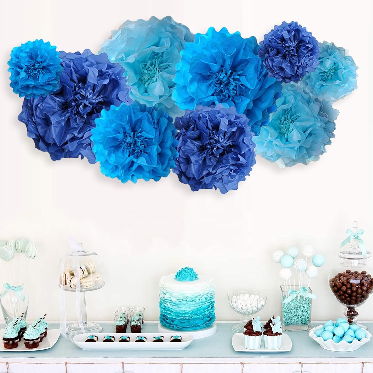 Blue Paper Flower Pom Poms Wall Decorations for Baby Showers, Weddings, Birthdays, Bridal, Tea Parties, Engagement, Home Decor