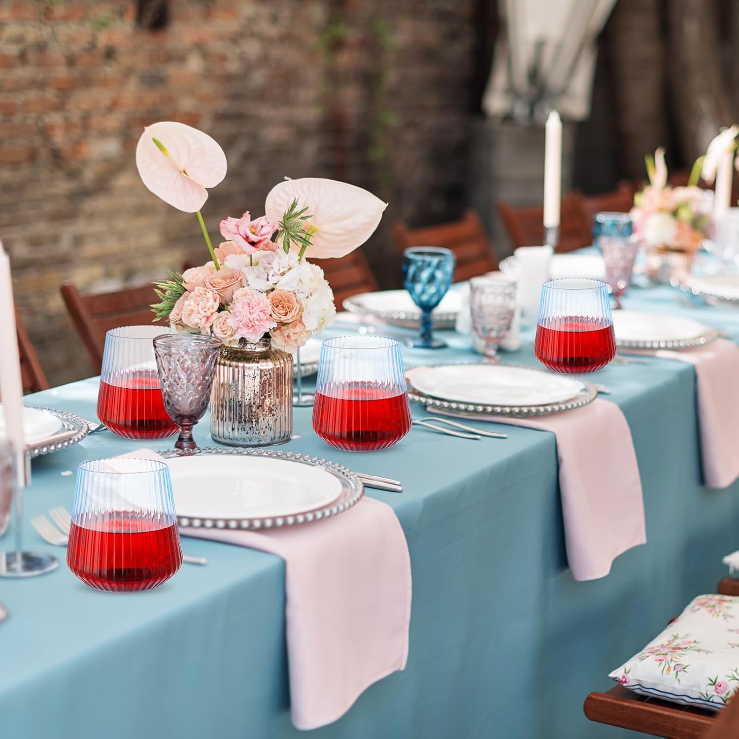 Suclain Plastic Wine Glasses Ribbed Stemless Wine Glasses 14oz Vertical Design Unbreakable Cups for Outdoor Indoor Vintage Elegant Champagne Whiskey Cups for Party Wedding (Blue,20 Pcs)