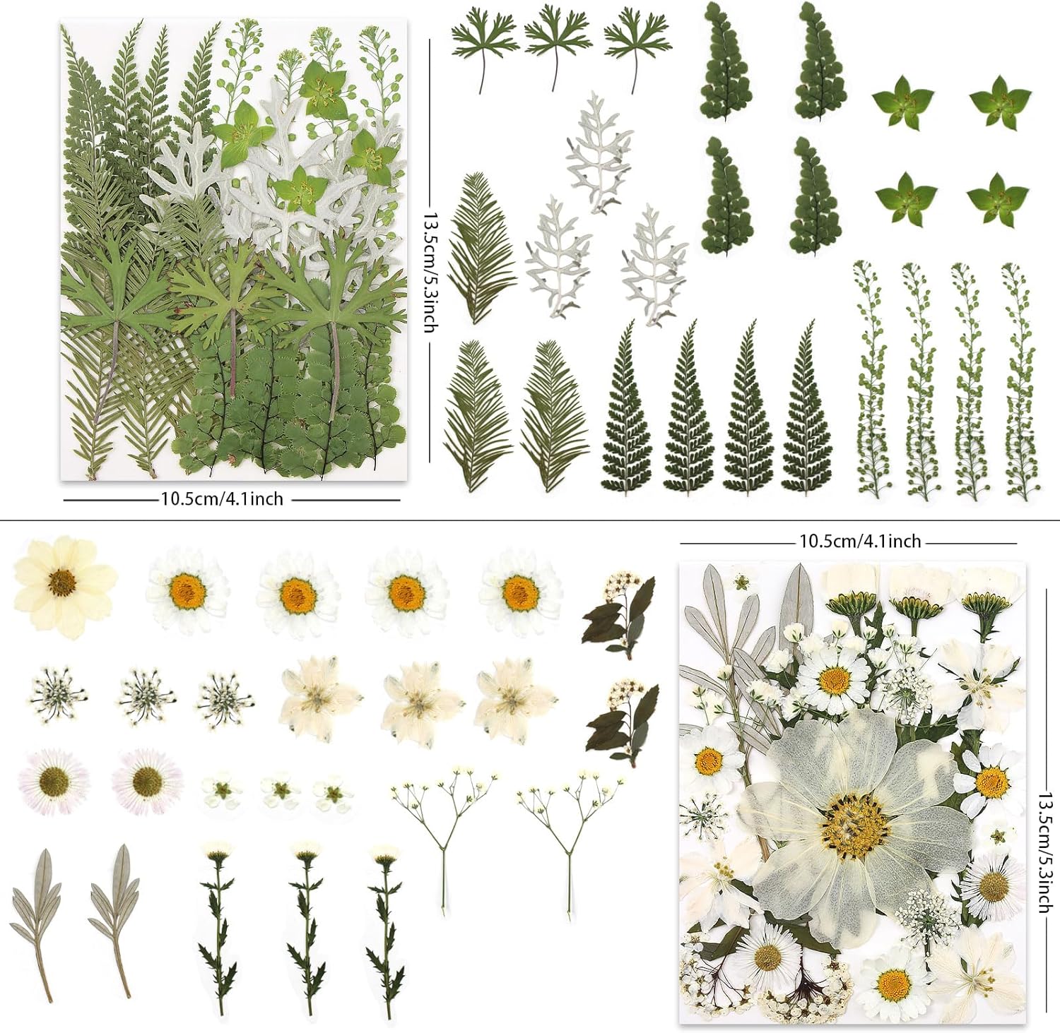 • Pure & Natural Dried Flowers:100P dried pressed flowers for crafts in elegant white with green foliage. Handpicked, naturally preserved, keep soft beauty. Perfect for resin art, jewelry, home decor—ideal for tranquil DIY projects