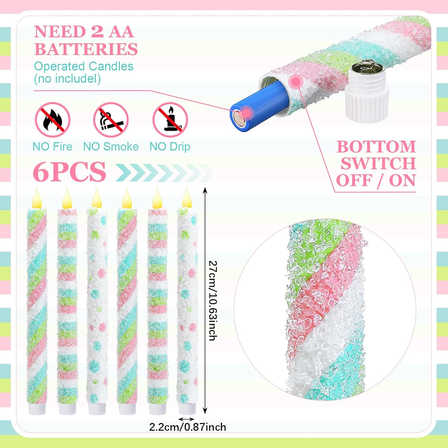 Baquler 6 Pcs Candy Theme Flameless Taper Candles 10.6 Inch Colorful Candy Strip and Polka Dots Candles Battery Operated LED Christmas Candlesticks for Xmas Centerpiece Holiday Party Home Decor