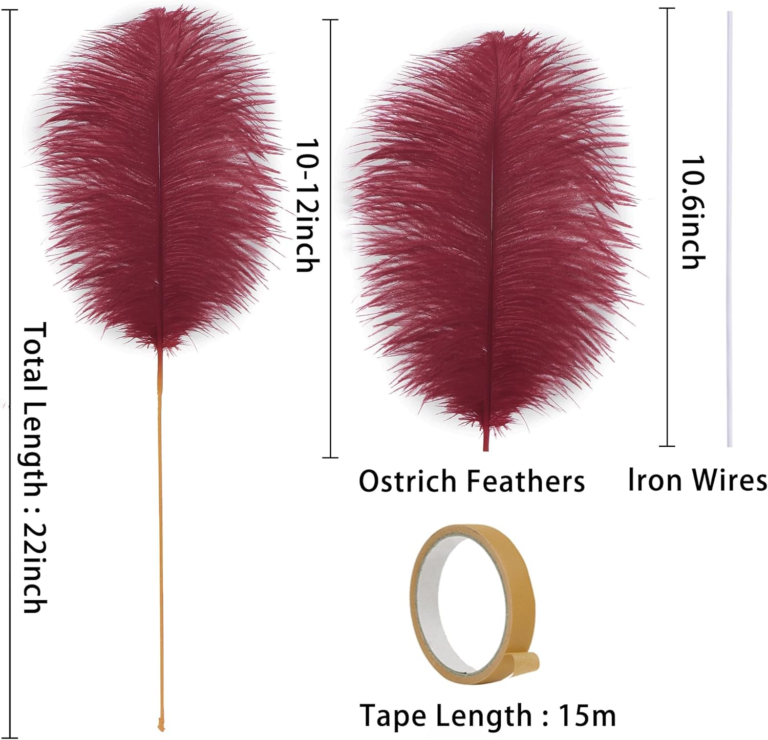 • 22inch Ostrich Feathrs Kit: 20pcs 10-12 inches burgundy ostrich feathers, 20 pcs 10 inches long iron wire, and a 15m tape in the same color with the feather. Rich set content to meet your decoration and use needs