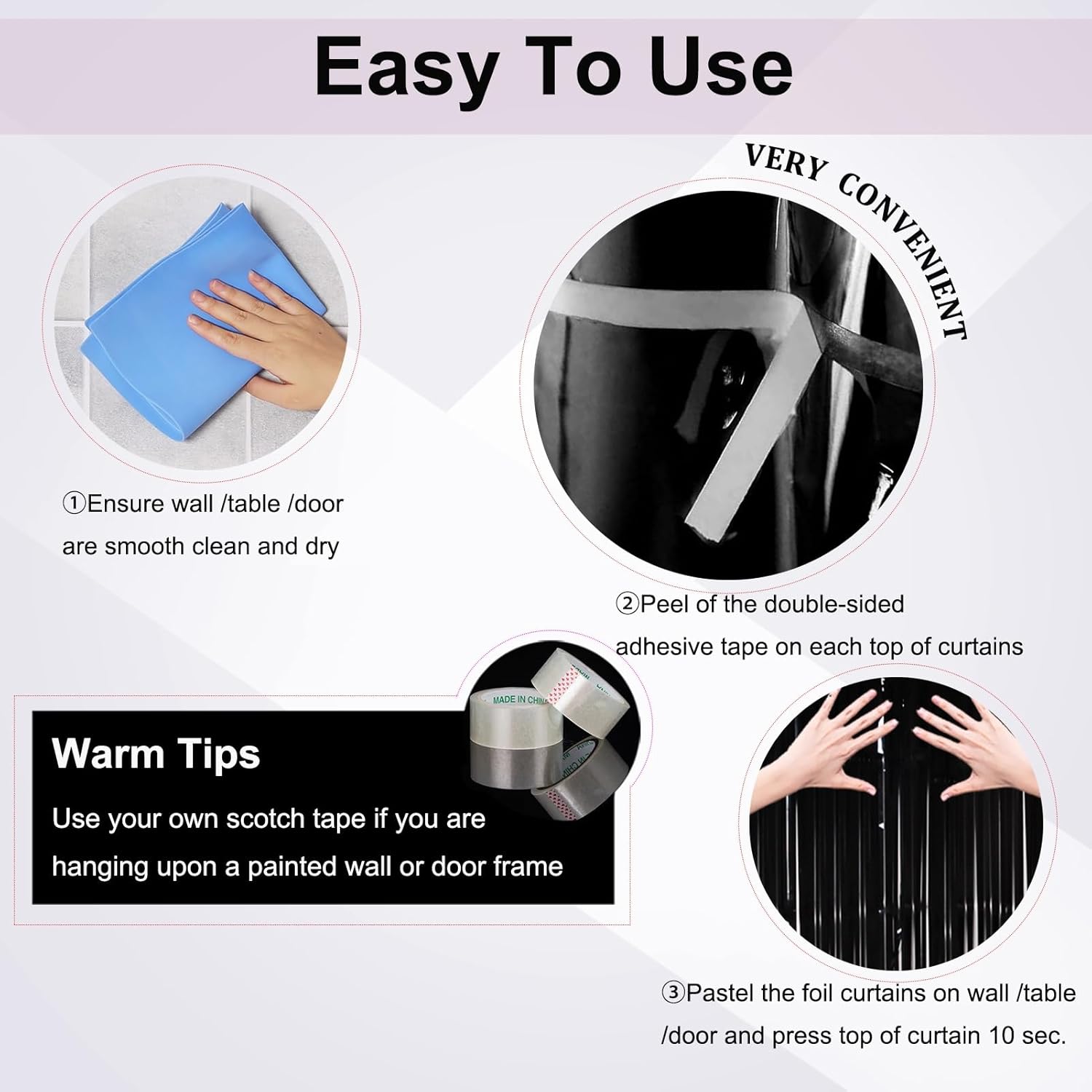 • đŸ–€ă€EASY TO USE】Let your home is no longer tedious,create warm atmosphere for your family. It only takes two steps--step1:Tear off the back of double-sided adhesive tape. step2: Paste the foil curtain on wall/door/table to decorate your party