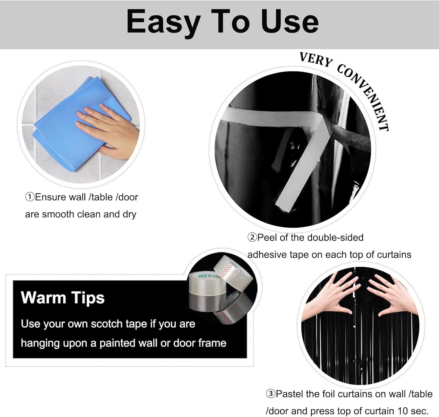 • 【EASY TO USE】Let your home is no longer tedious,create warm atmosphere for your family. It only takes two steps--step1:Tear off the back of double-sided adhesive tape. step2: Paste the foil curtain on wall/door/table to decorate your party