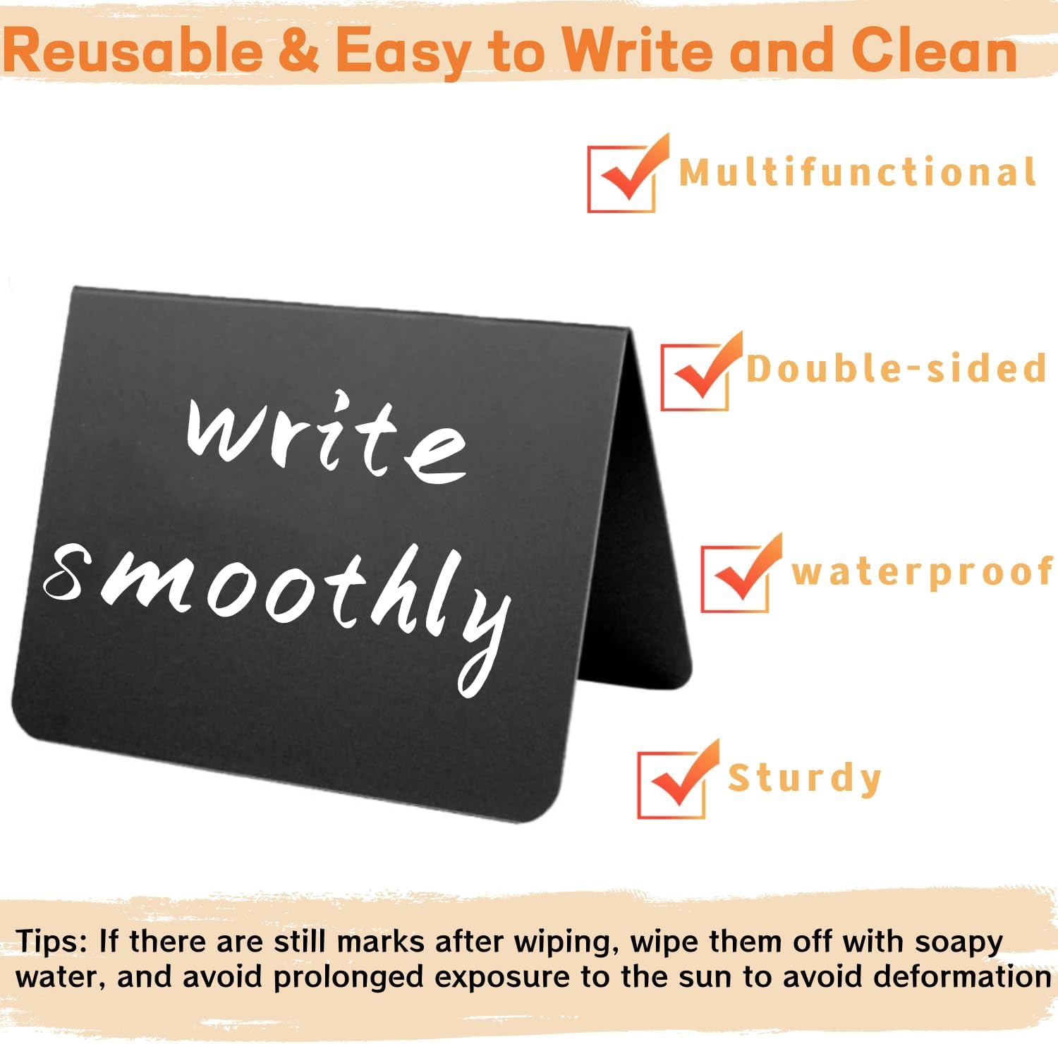 • STURDY CONSTRUCTION: The small chalkboard sign is made of dark matte black plastic material, sturdy and waterproof, not easily deformed or broken, each sign features V-shaped design that keeps it upright and visible, with a writing surface that's easy to read