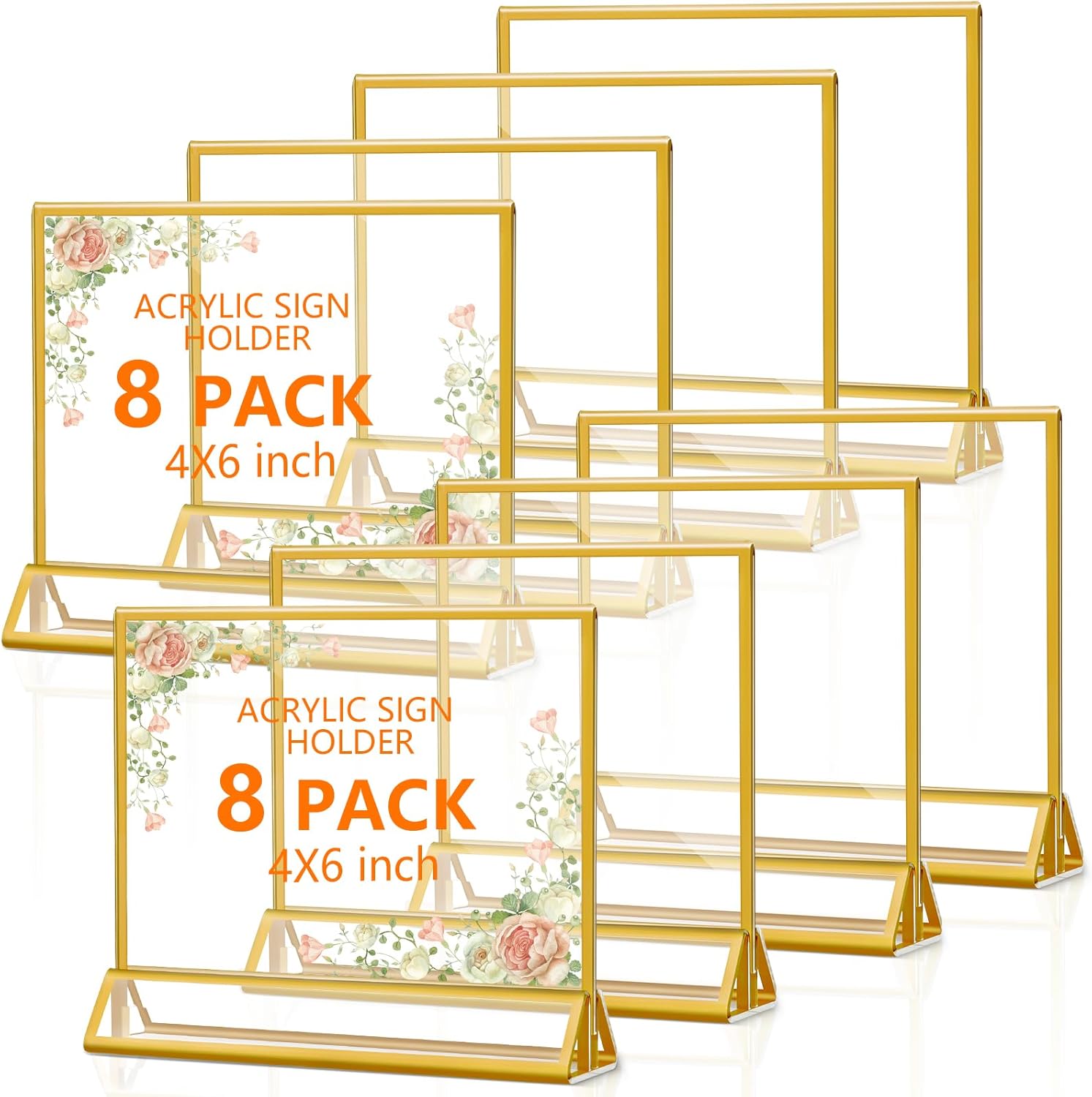 8 Pack Acrylic Sign Holders with Golden Border, Double Sided Clear Picture Frames, 6 x 4 Table Number Holders, Horizontal Menu Holders for Wedding Reception Art Display Party Decoration