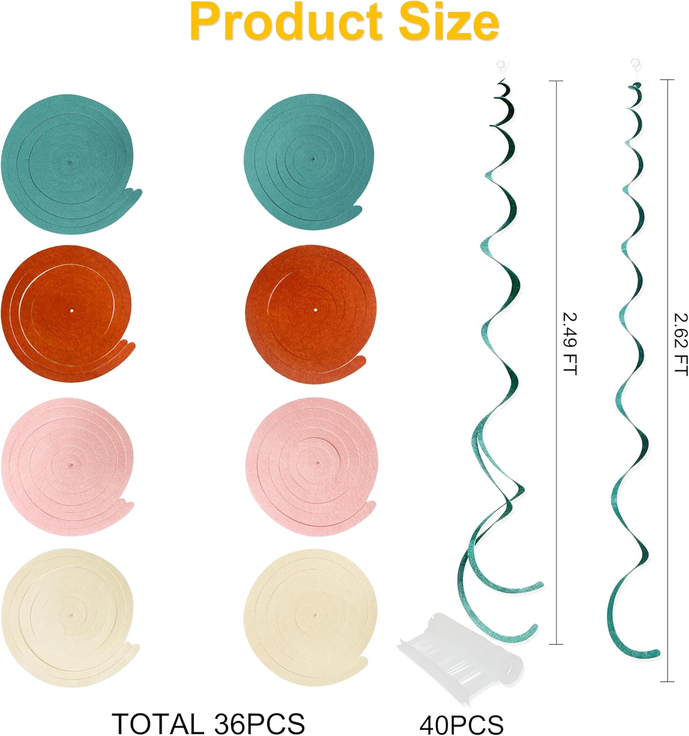 • Package Contains - 36 packs of boho color swirl party streamer,Each swirl can extends to approximately about 2.62 feet long,Meeting daily general needs.Comes with 40 plastic hooks for hanging.